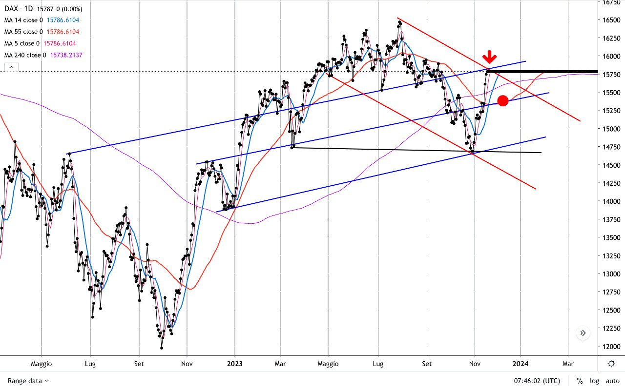 Si era identificata una possibile RESISTENZA attorno ai 15750-15800 punti (trendline discendente dai massimi parallela alla trendline dei MINIMI) ma al momento non abbiamo ancora segni di cedimento (siamo poco sopra i 15800 punti).