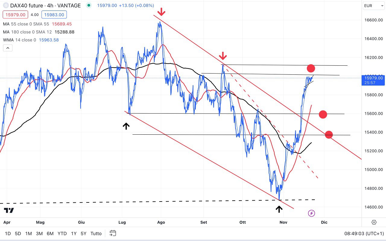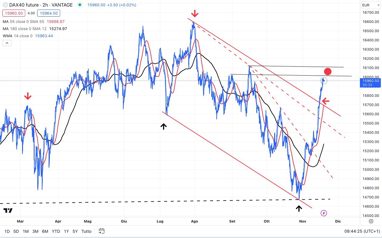 Il CANALE parallelo alla retta dei MINIMI è stato nettamente bucato al RIALZO, sia in prima battuta attorno ai 15550-15600 punti e poi con la rottura dei 15750 punti, mentre ora siamo già in prossimità dei 16000 punti.