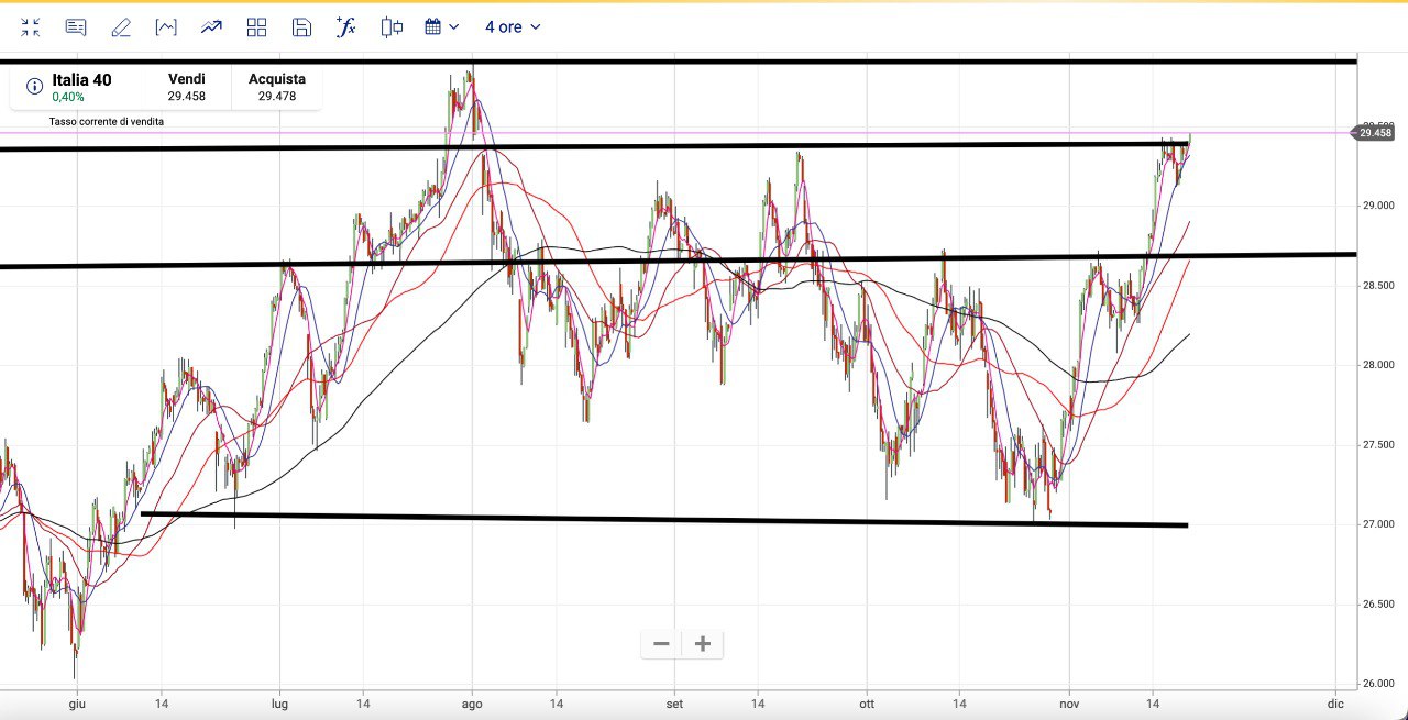 Sul MIB è stato raggiunto nuovamente il massimo del 20 Settembre attorno ai 29500-29600 punti e quindi si potrebbe in prospettiva ritornare sui massimi dell’anno fatti a fine Luglio.
