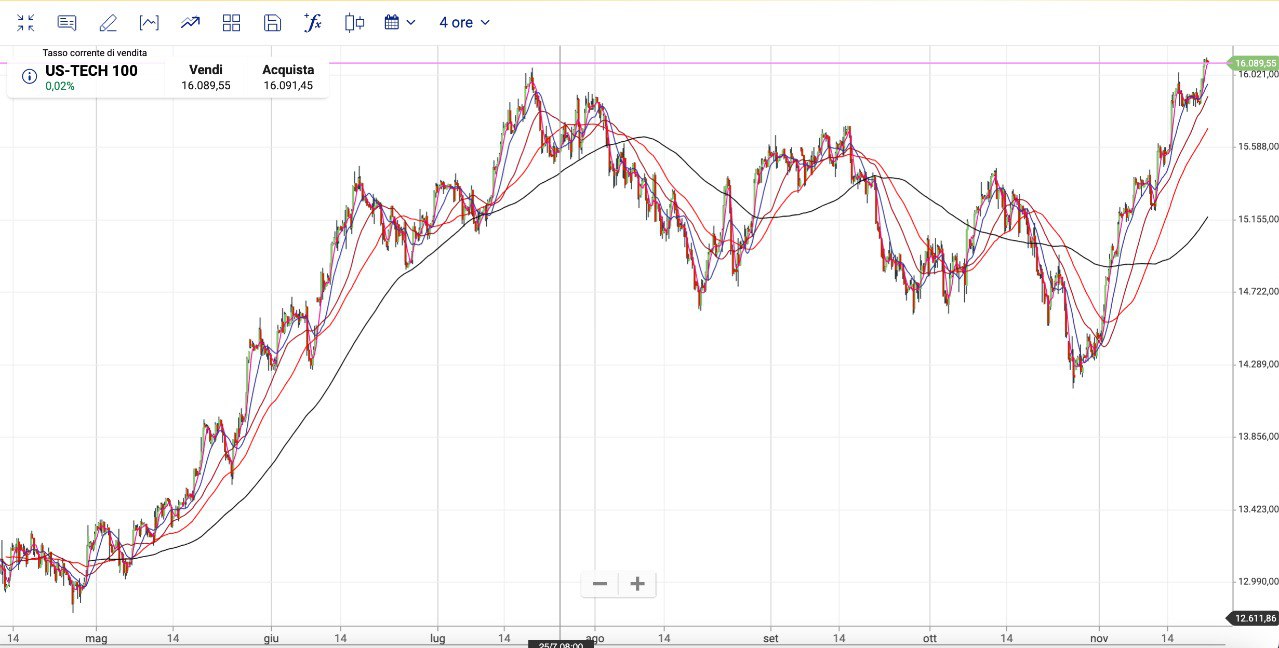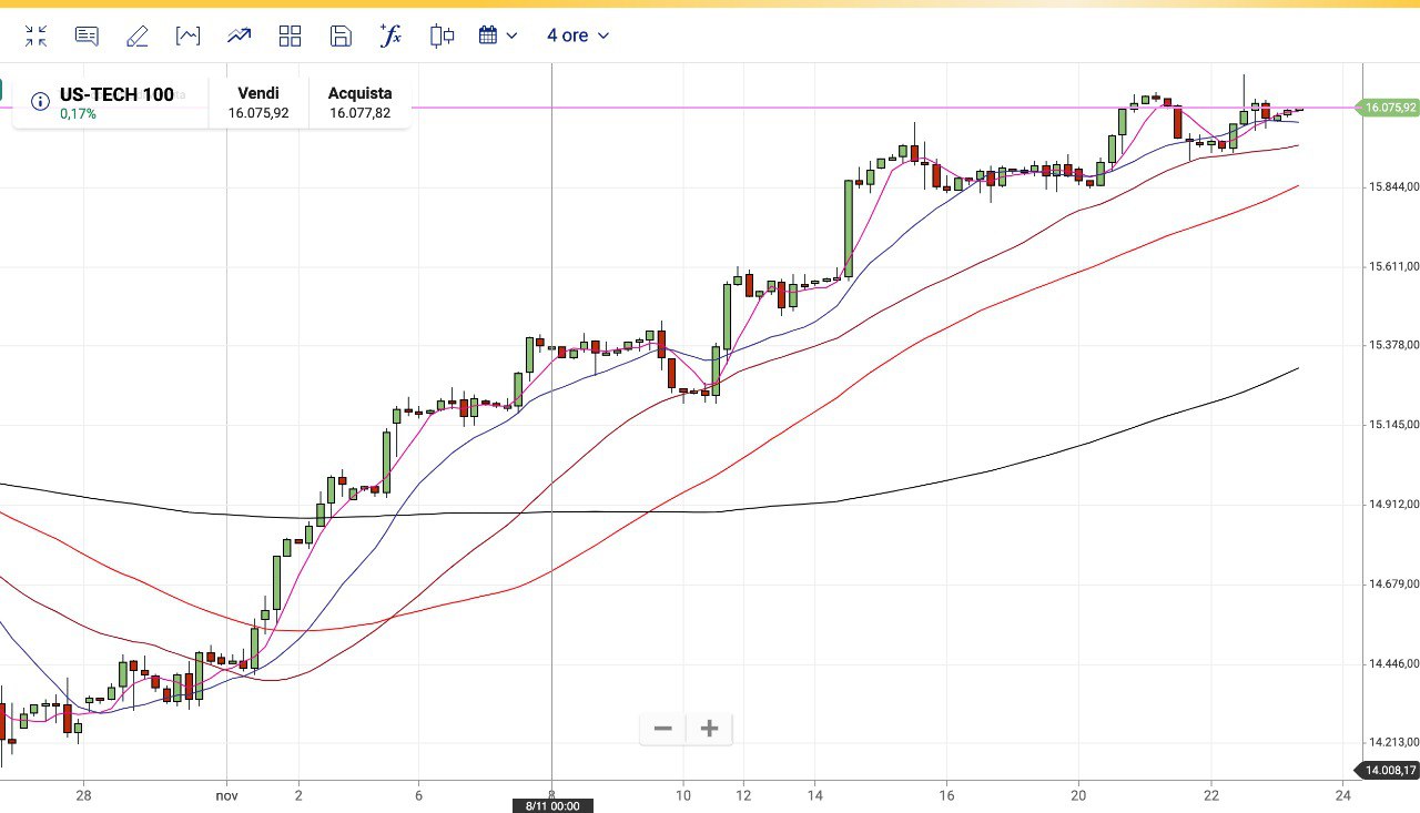 Il NASDAQ 100 continua a mantenersi in alto e ieri ha fatto una “sparata” attorno ai 16200 punti prima di assestarsi su valori più bassi.