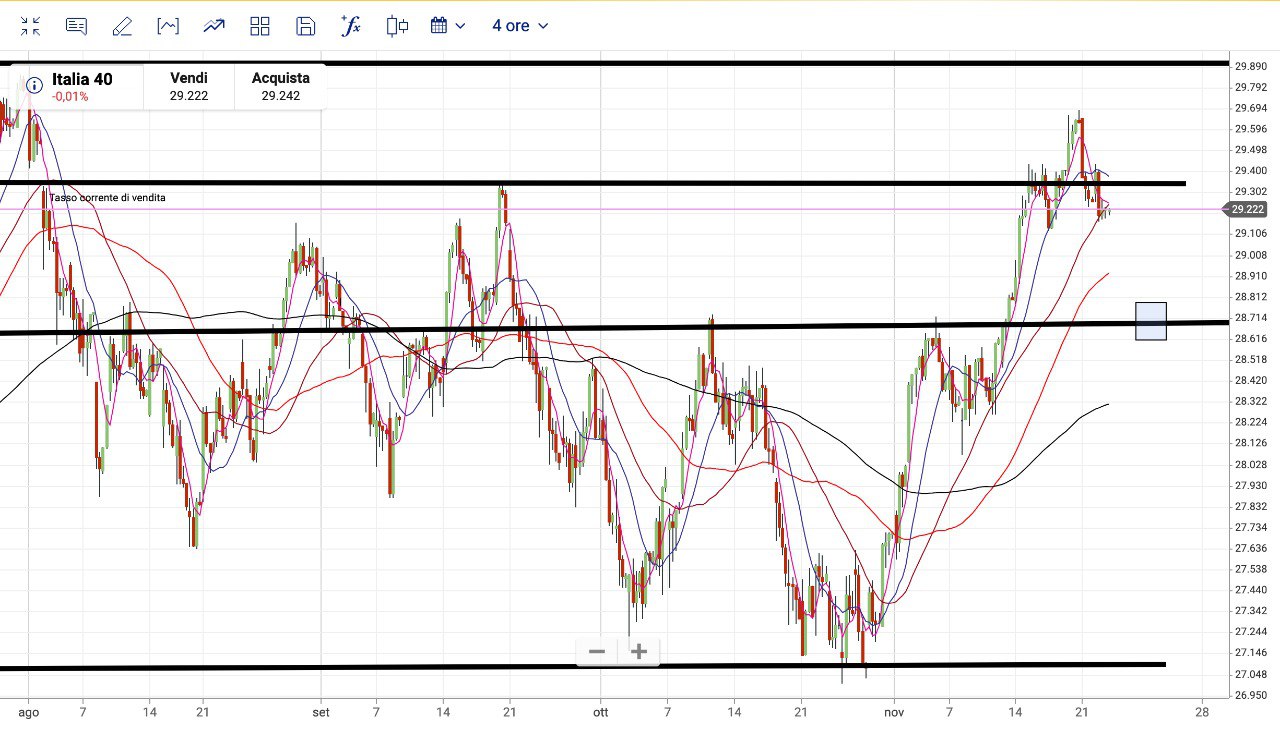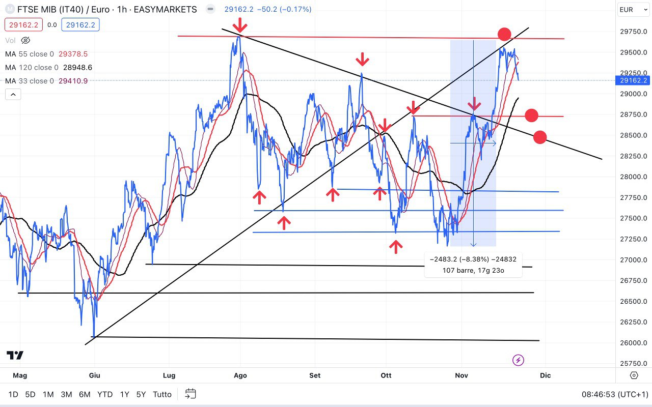 Se NASDAQ e DAX sono rimasti in alto, il FTSE MIB al momento è sceso di quasi 500 punti dai MASSIMI fatti poco sotto i 29700 (ieri siamo andati sotto i 29200 punti).
