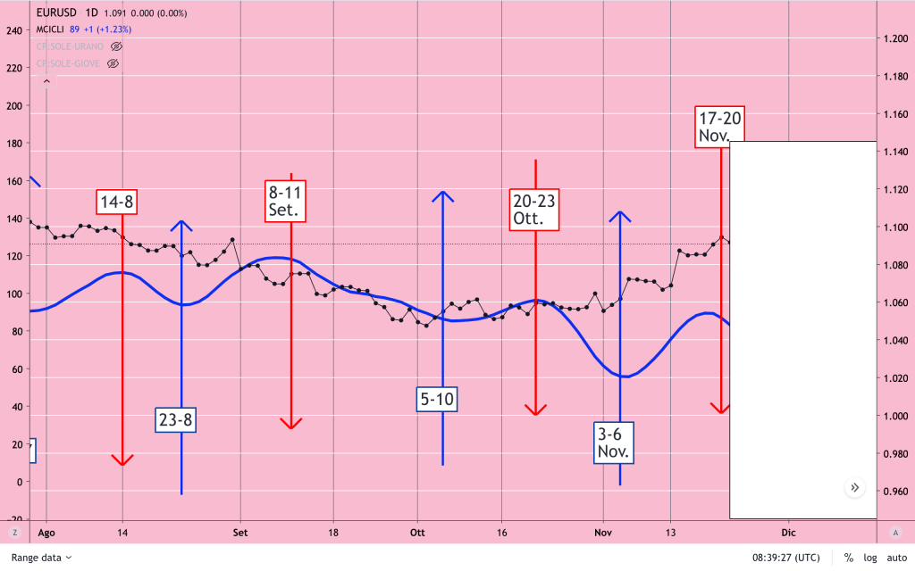 Per rientrare dunque in direzione rialzista converrebbe attendere che la LUNA ritorni verso la CONGIUNZIONE con GIOVE e URANO (fine Novembre) mentre ora appare più probabile che si possa scendere….