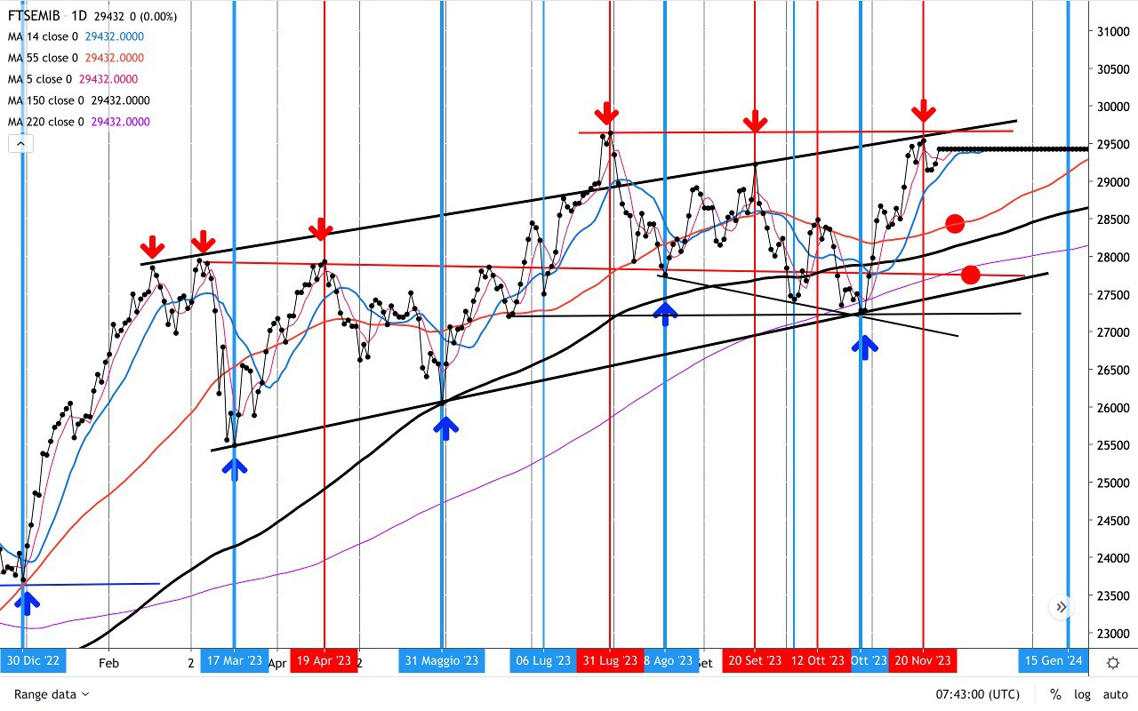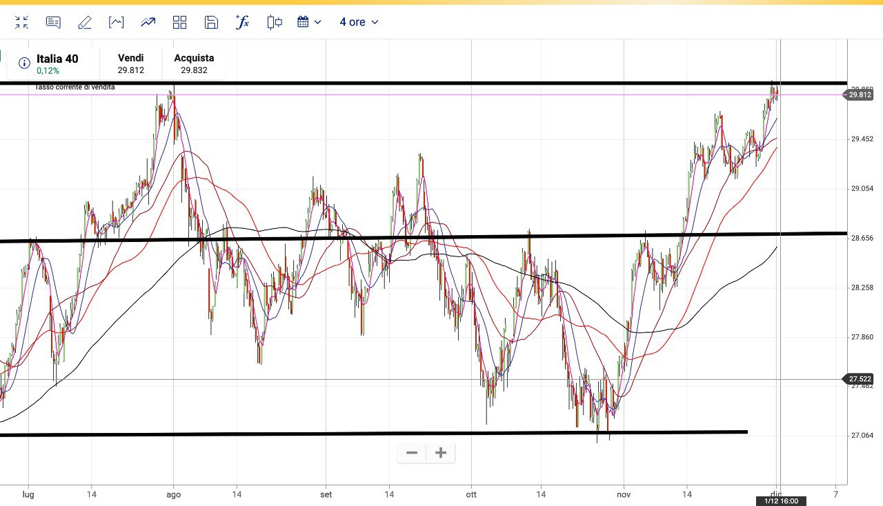 ll FTSE MIB ha fatto un MASSIMO il giorno 20 Novembre ed è sceso di circa 500 punti sulla soglia dei 29100 punti per ritornare poi verso l’alto dove si trova adesso (il FUTURE vale circa 29500 punti).