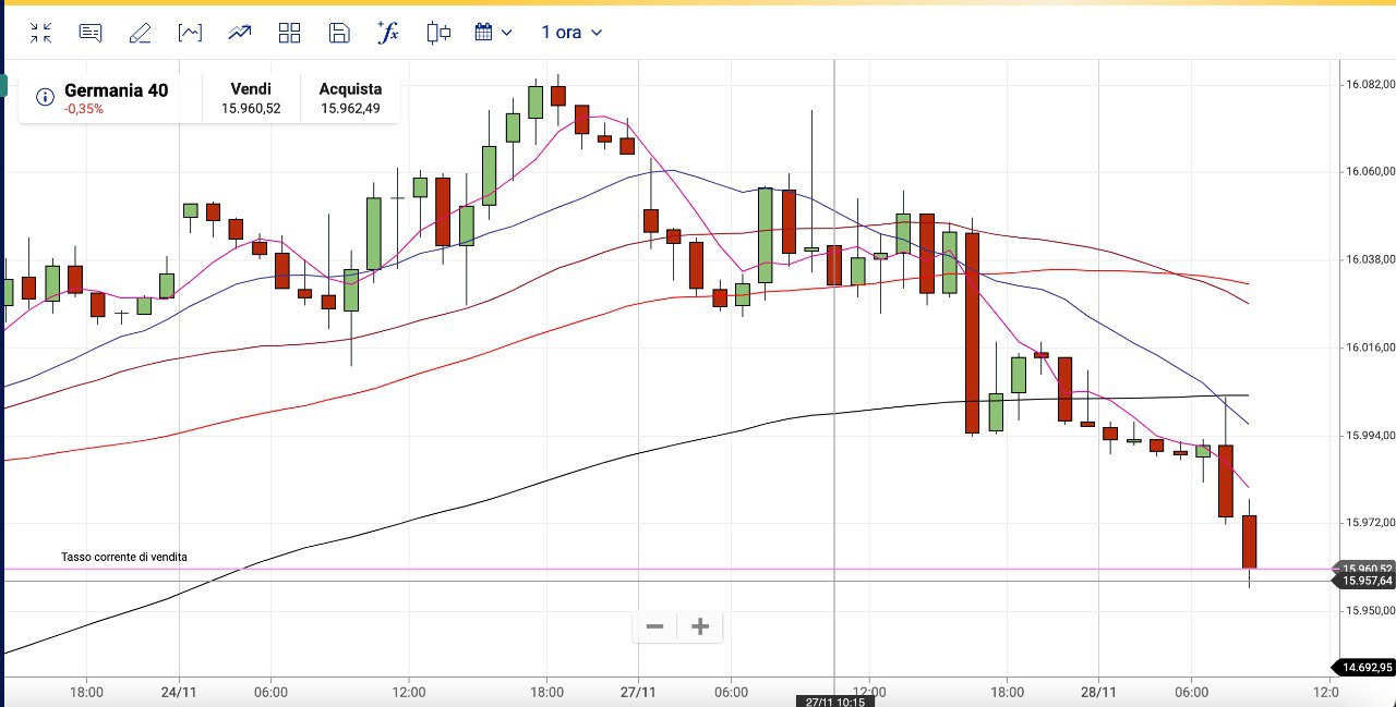 Il DAX è sceso sotto la soglia dei 16000 punti e si trova ora attorno ai 15960 punti.
