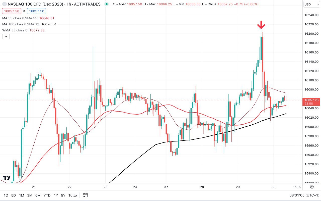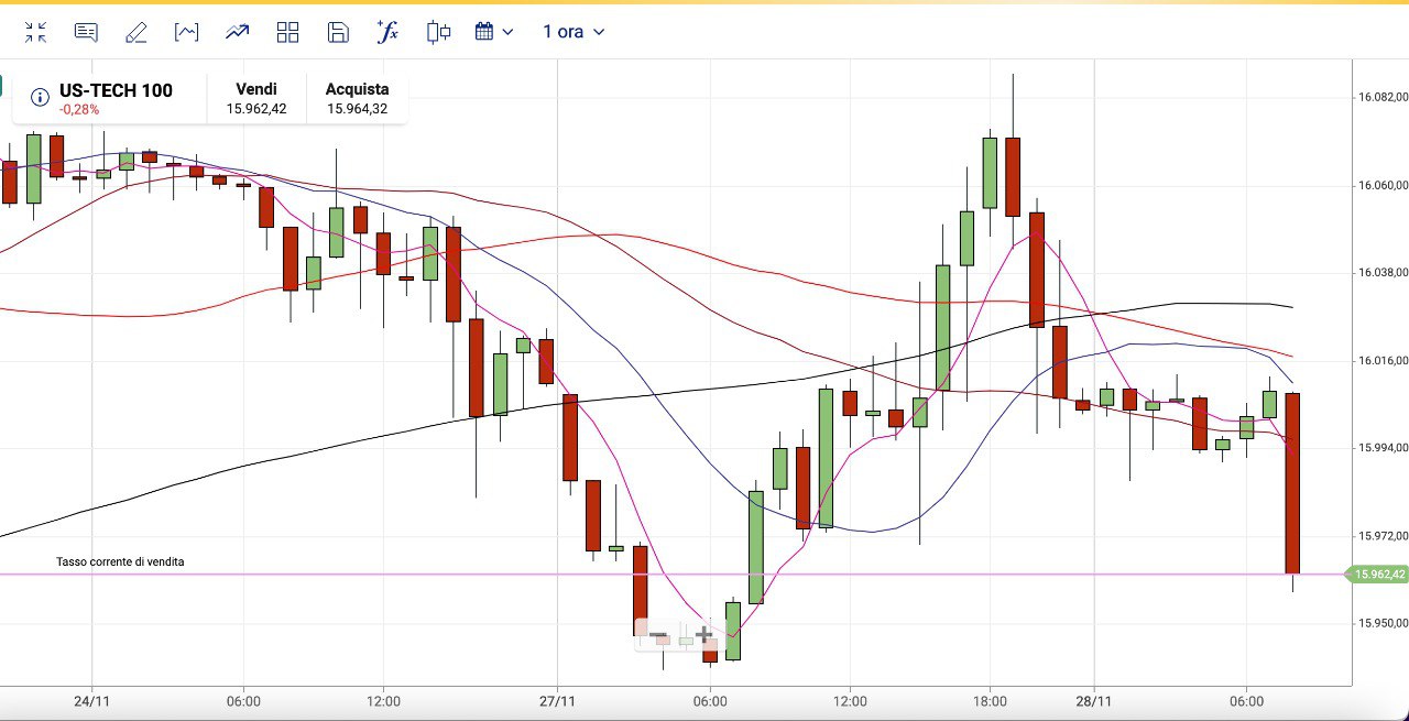 Il NASDAQ 100 viaggia sotto i 16000 punti ma gli indici europei MIB e DAX si sono mossi verso l’alto.