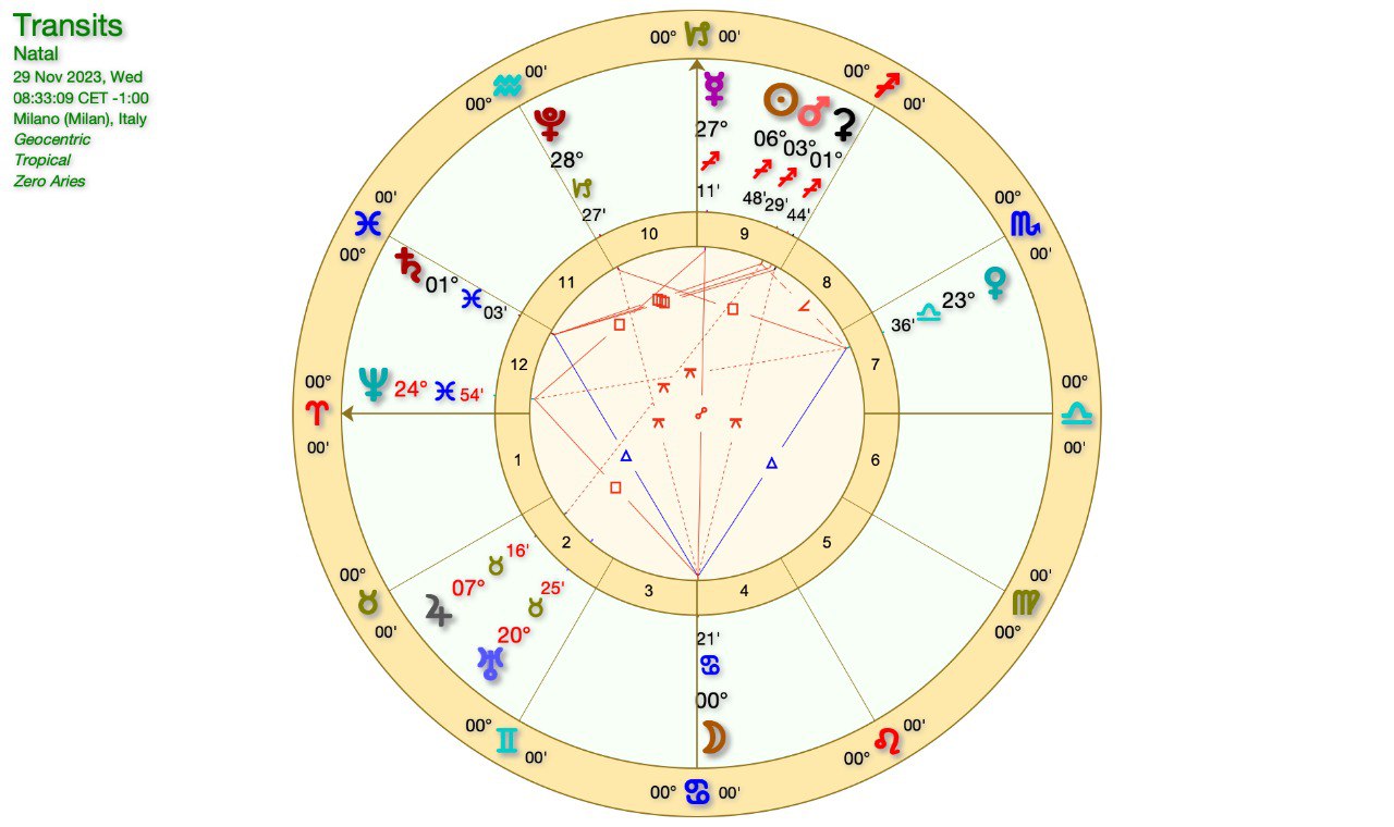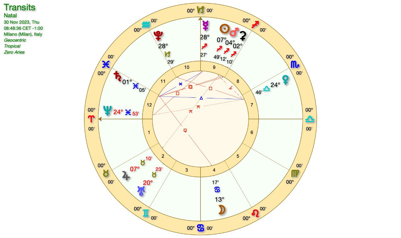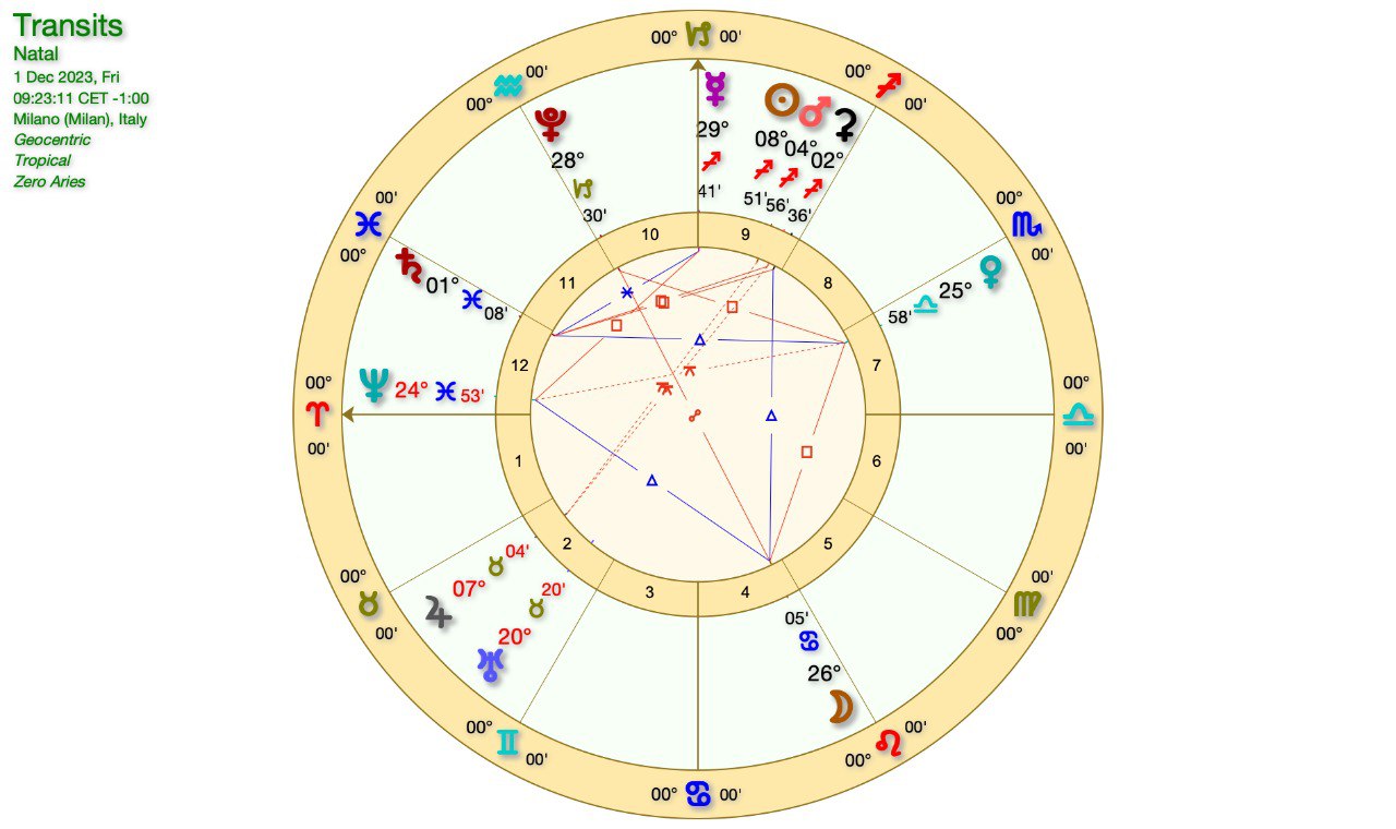 La configurazione astrologica continua ad essere piuttosto conflittuale, con SOLE-MARTE-CERES i(in SAGITTARIO) in QUADRATURA a SATURNO in PESCI.