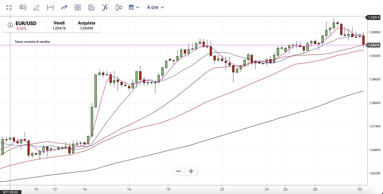Un’occhiata anche al cambio EURODOLLARO, che l’altro ieri potrebbe aver fatto un PICCO significativo sopra 1,10, mentre ora ci troviamo attorno a 1,095.