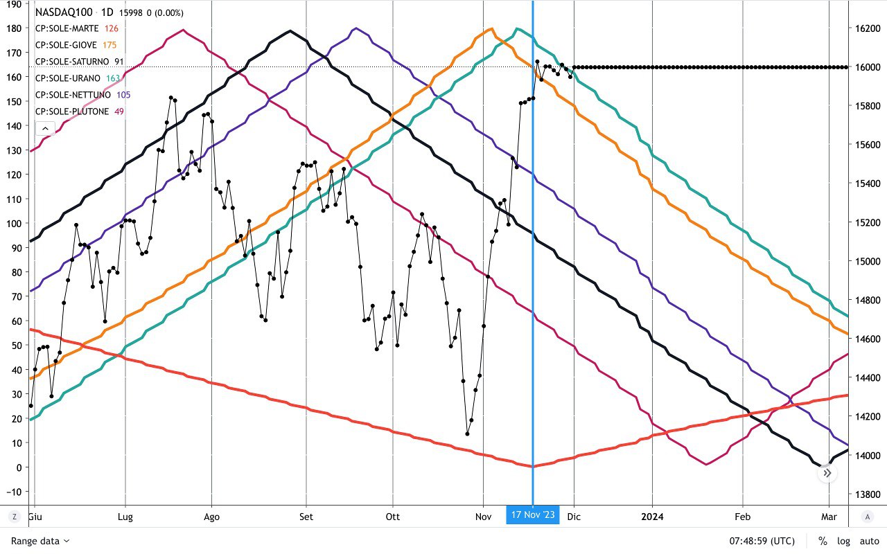 Qui sopra vedete proprio i CICLI SOLARI sul DAX, con la CONGIUNZIONE SOLE-MARTE che era già nell’orbita da diversi giorni e che dopo il 18 Novembre ha favorito l’ultima accelerazione verso l’alto.