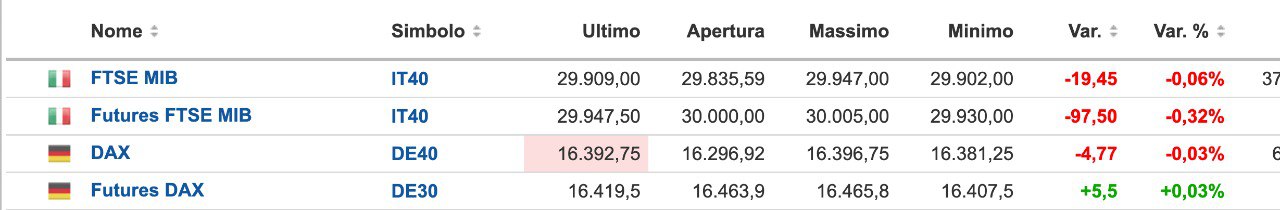 Queste intanto le QUOTAZIONI dopo l’apertura delle ore 9 sui mercati europei, con il MIB a 29950 e il DAX a 16420 punti.