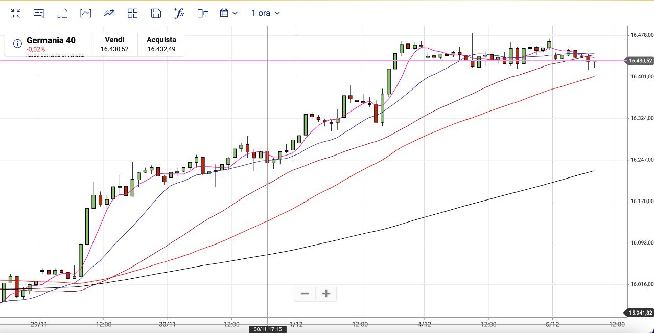 Il DAX, come detto, si trova ancora sopra i 16400, quindi registriamo una netta differenza di comportamento rispetto al NASDAQ 100.