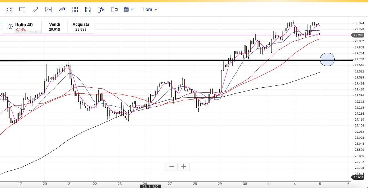 Stamattina siamo tornati sotto i 30000 punti e qualora il ritracciamento proseguisse avremmo un primo obiettivo attorno ai 29700 punti, sui livelli del precedente massimo poi superato al rialzo.