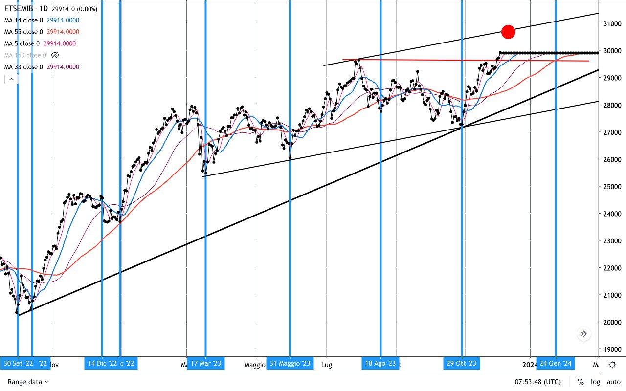 In prospettiva, qualora venisse replicato il primo movimento impulsivo partito a fine Settembre 2022, che fece circa 4500 punti, il nostro indice potrebbe raggiungere i 31500 punti circa, avendo avviato l’attuale impulso rialzista dalla soglia dei 27000 punti ( 27000 +4500 = 31500 punti).