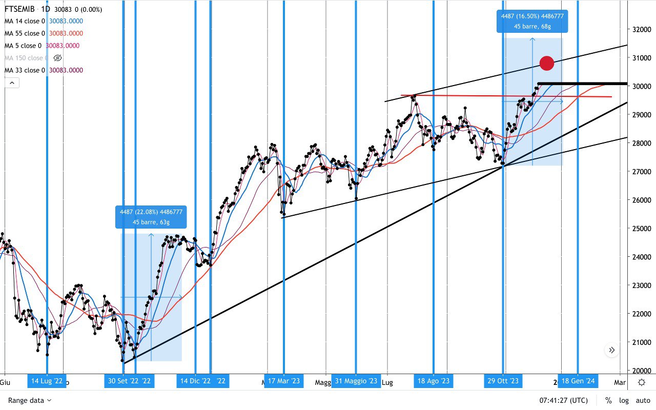Va aggiunto che l’anno scorso, come ricorderete, quando partì il movimento impulsivo a fine Settembre – inizio Ottobre, il FTSE MIB percorse 4500 punti al RIALZO, per cui se la misura dovesse ripetersi potremmo arrivare a 31500 punti circa, in quanto a fine Ottobre 2023 siamo partiti dalla soglia dei 27000 punti (27000+4500= 31500 punti circa).