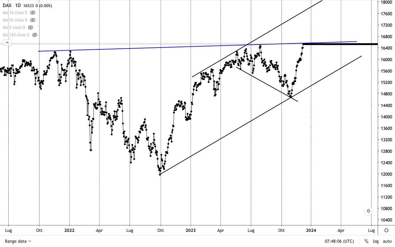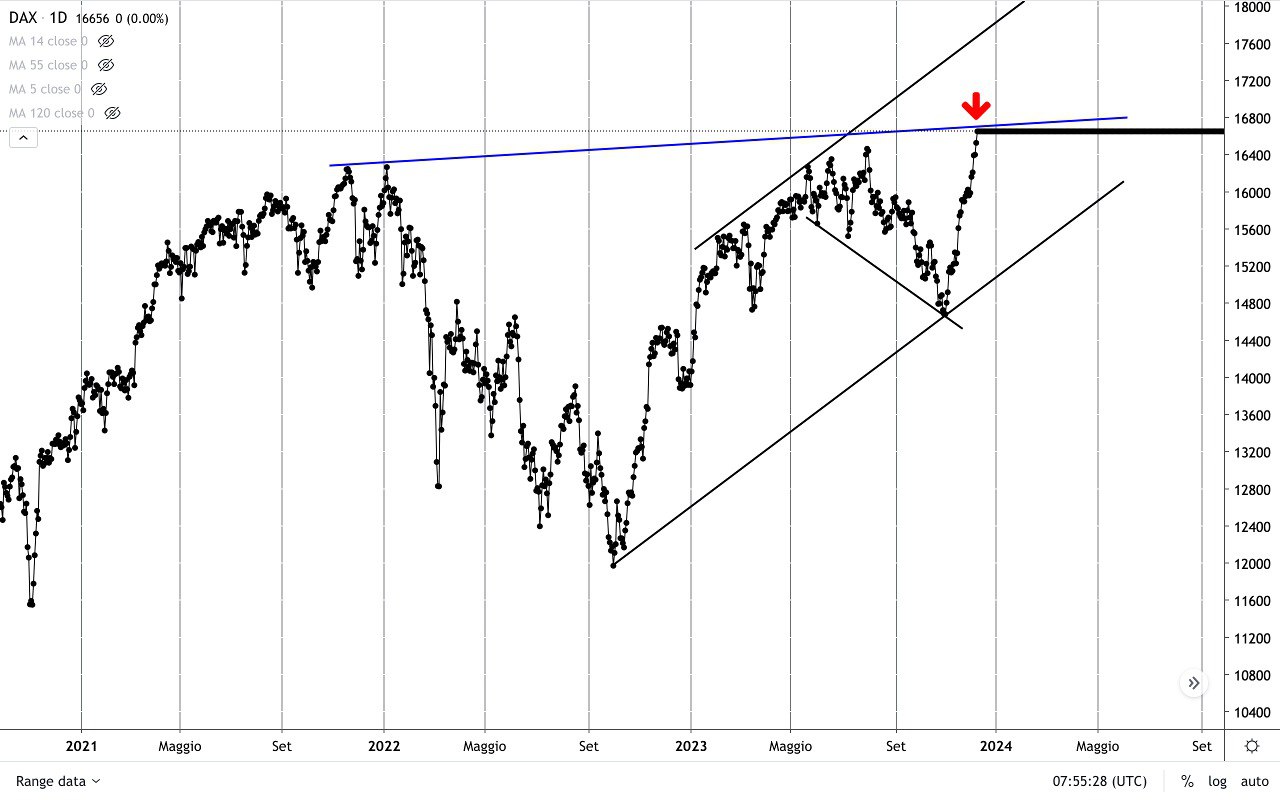 L’INDICE DAX (qui sotto nel grafico) si trova sulla LINEA dei precedenti MASSIMI del 2021-2022, pur avendo superato il massimo annuale del 2023 (come peraltro anche il FTSE MIB).