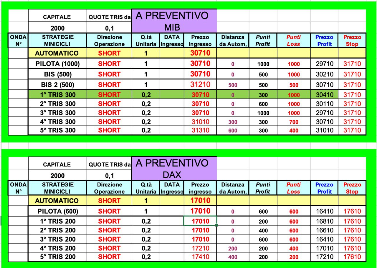 Dal punto di vista delle STRATEGIE, visto che la POSIZIONE di riferimento è al RIBASSO dai 30710 di MIB e 17010 di DAX, ieri è scattato il take profit della prima QUOTA di TRIS sul DAX a 16810 (+200 punti), mentre sul MIB era già scattata a 30410 (+300 punti) la settimana scorsa.
