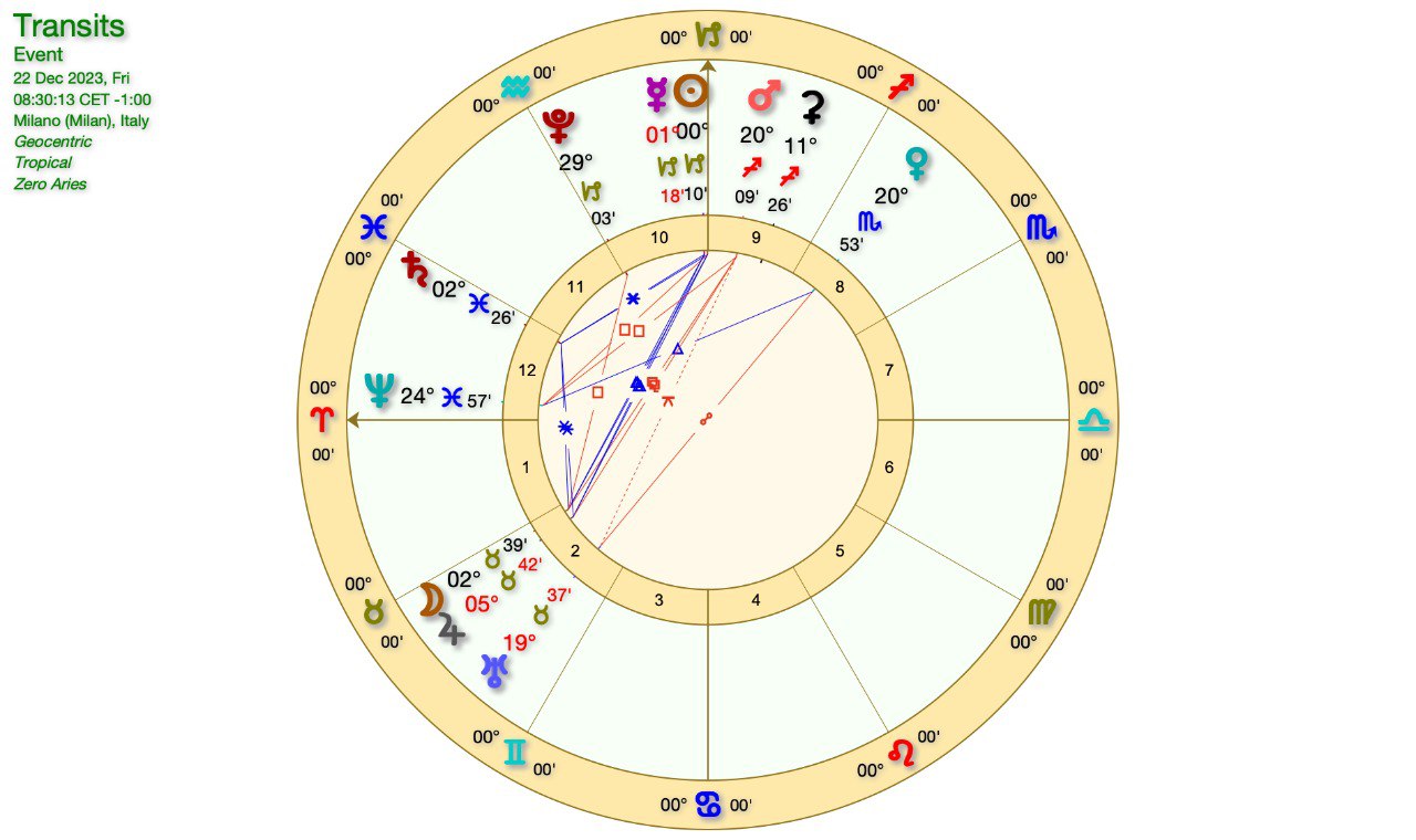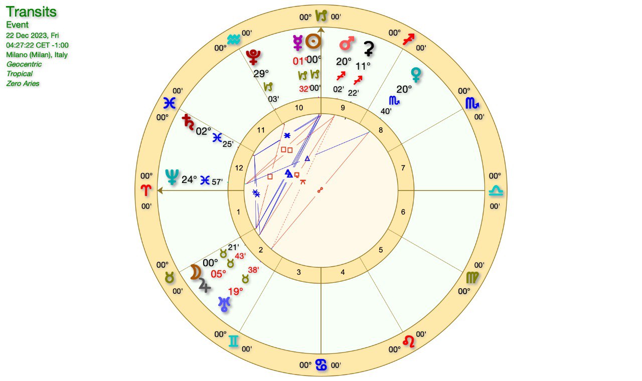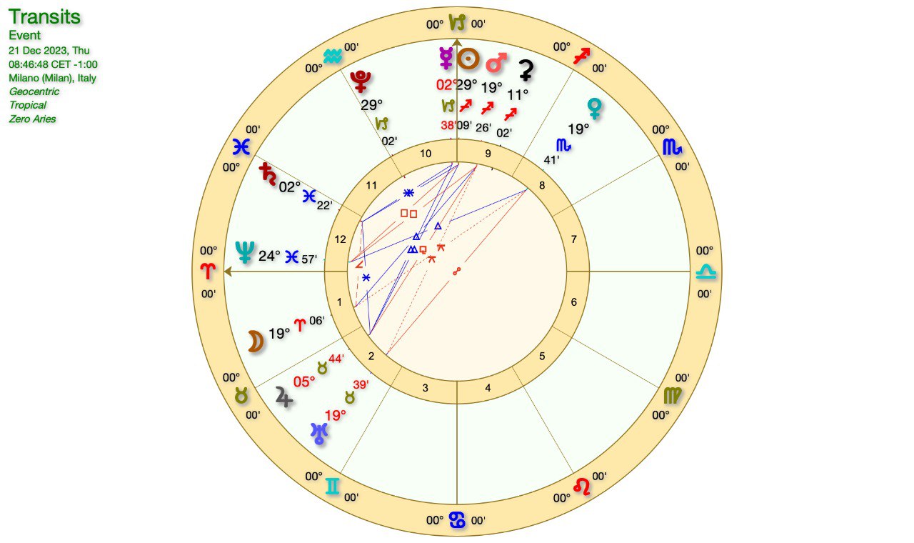 Il SOLE è già entrato in CAPRICORNO (SOLSTIZIO d’INVERNO) e si trova in CONGIUNZIONE a MERCURIO (retrogrado) e in TRIGONO a GIOVE in TORO.