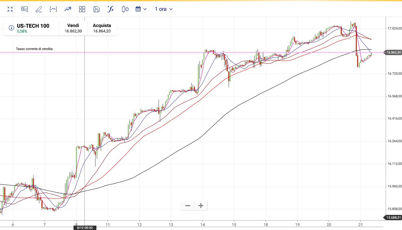 Ieri sera il NASDAQ 100 ha fatto un picco massimo interessante poco sotto i 17100 punti, per poi ripiegare con decisione di circa 300 punti.