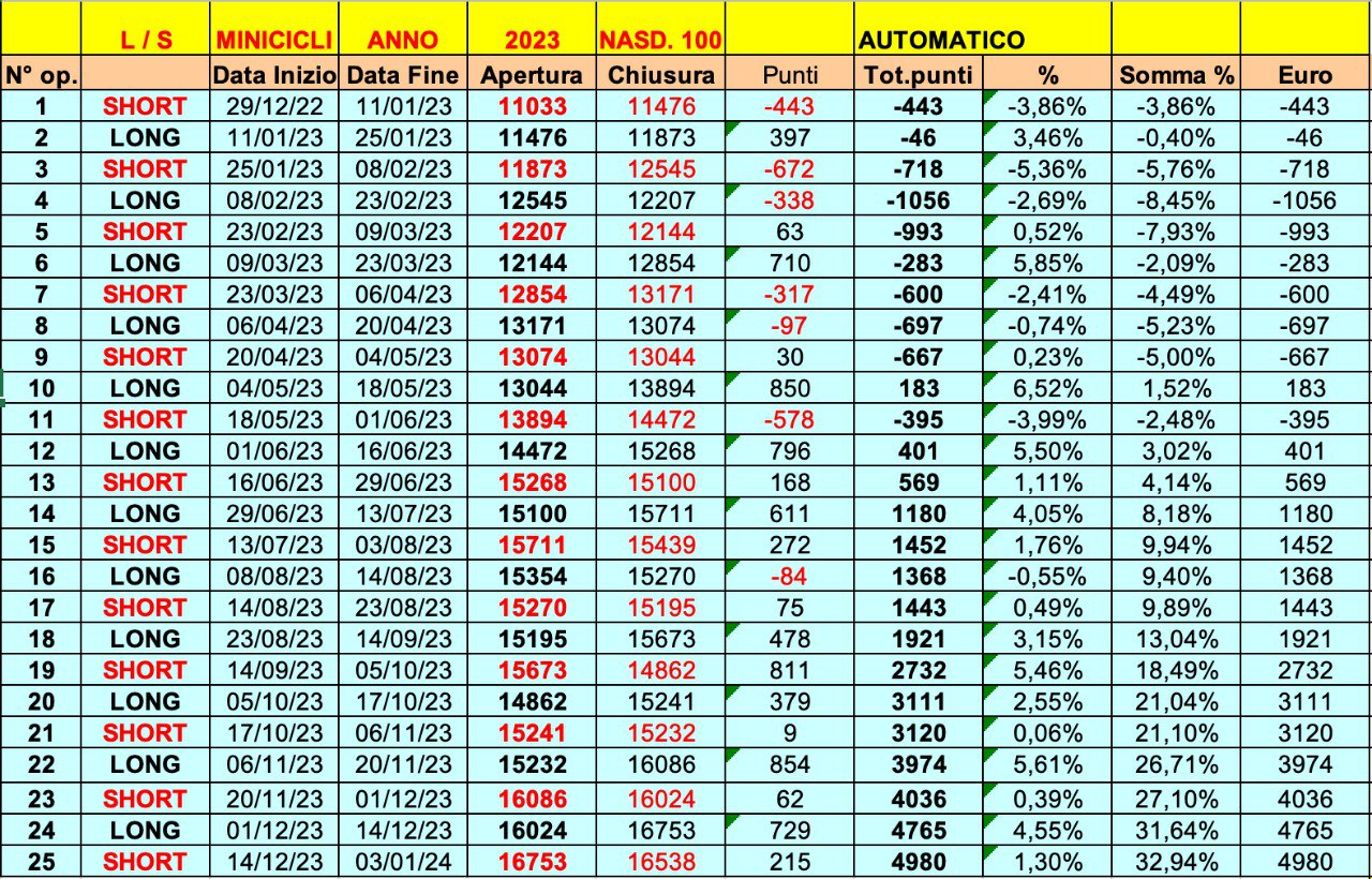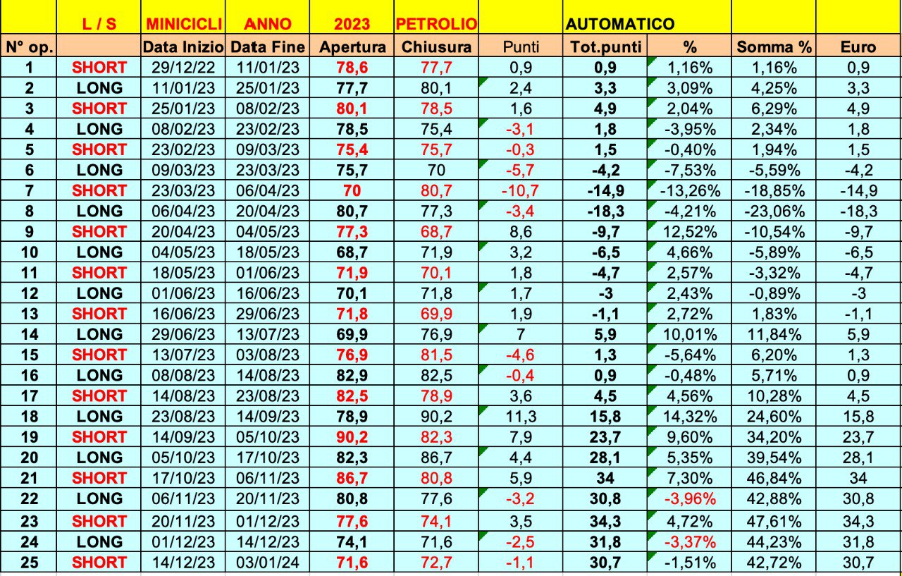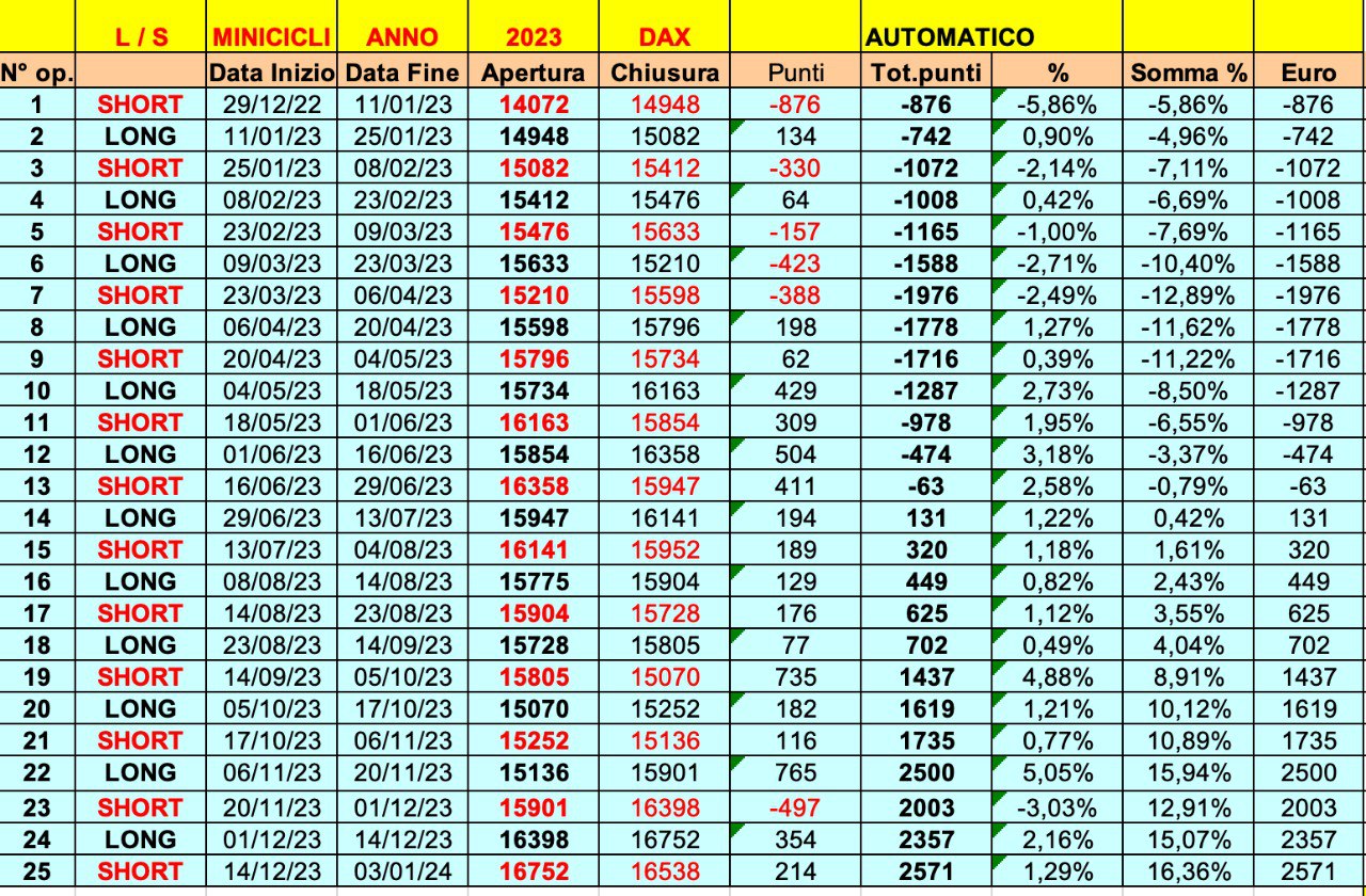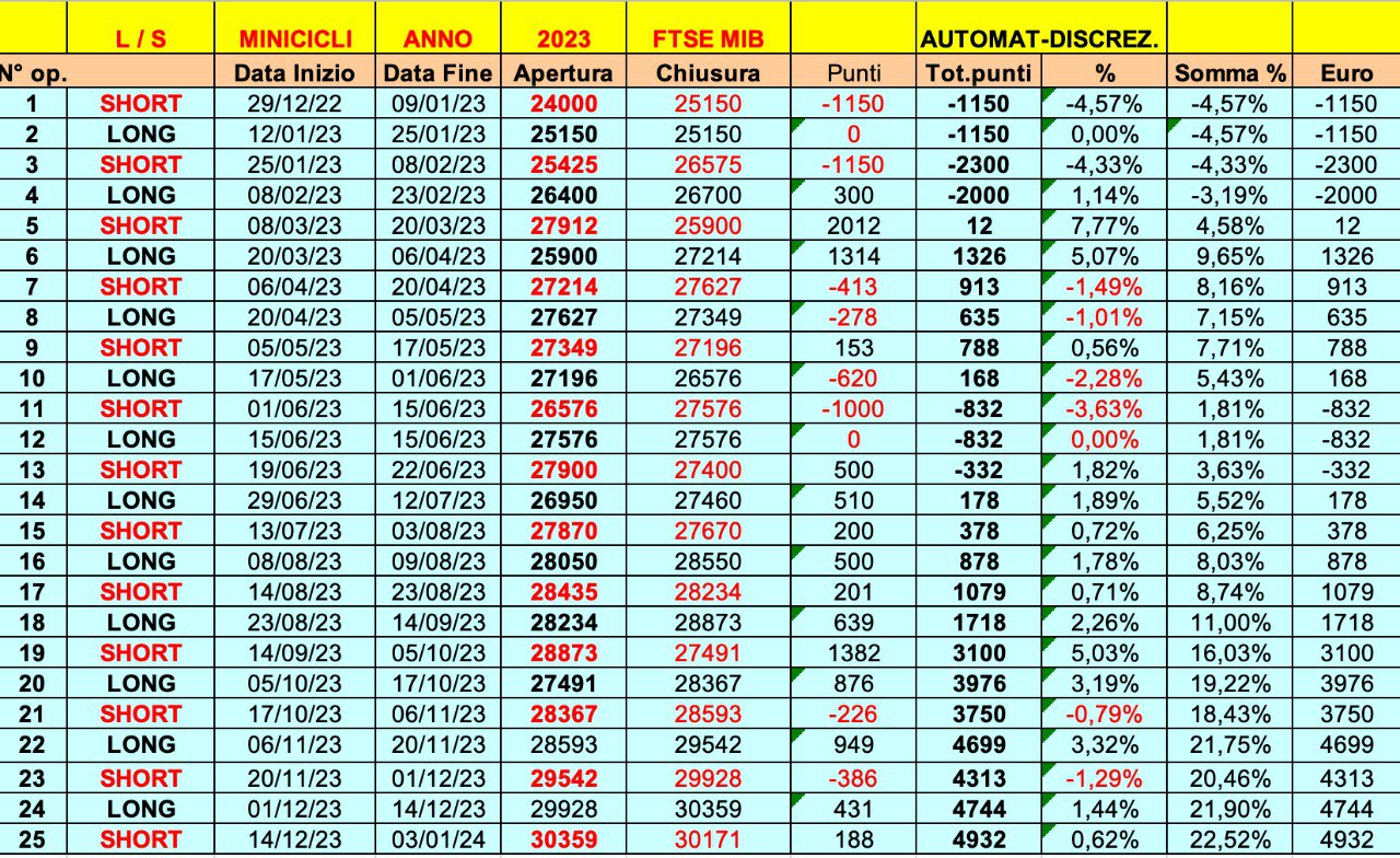 Riprendiamo le 25 ONDE 2023 sul FTSE MIB (“misto” di automatico e discrezionale).
