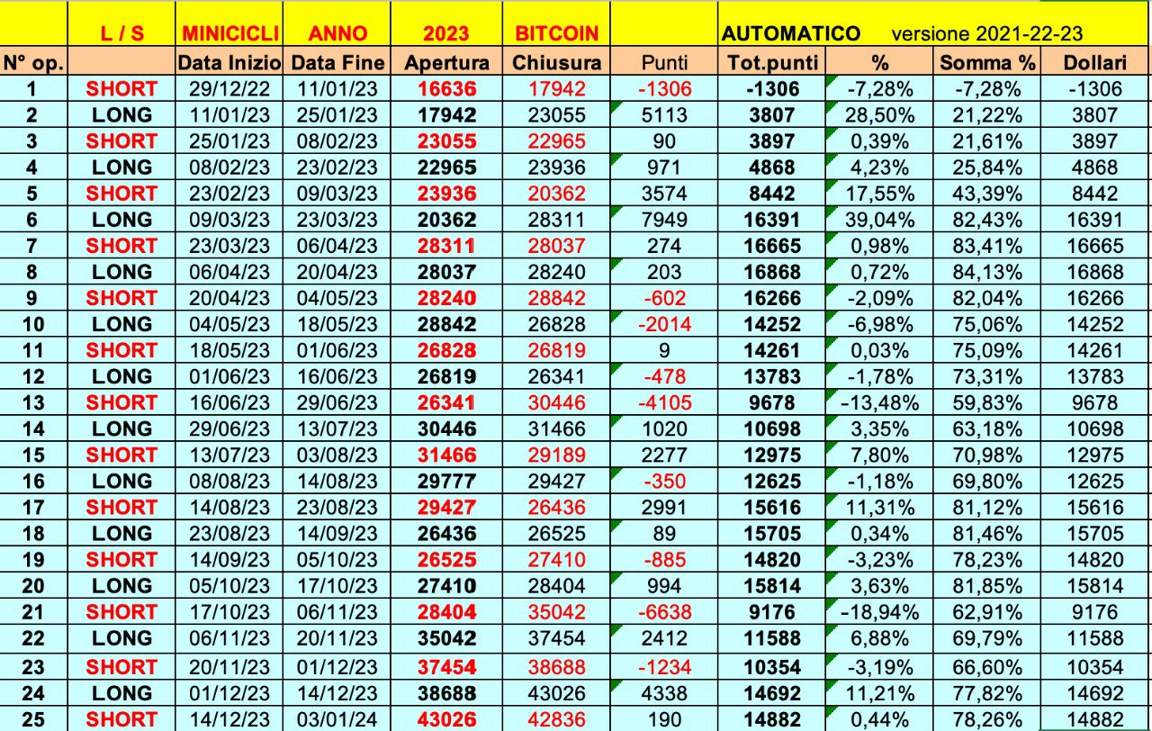 Il mercato migliore nella correlazione con i MINICICLI è però il BITCOIN, con una performance di +78%.
