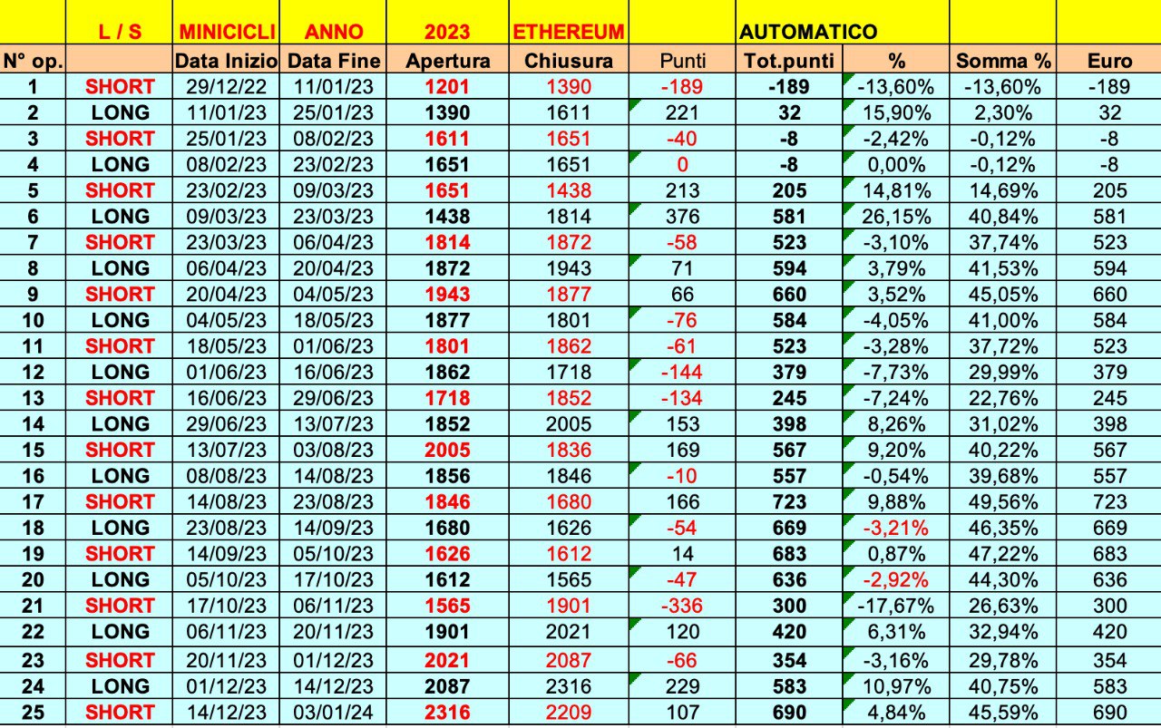 Vi mostro la statistica anche su ETHEREUM, arrivato al +45% (inferiore al BITCOIN ma comunque buono).