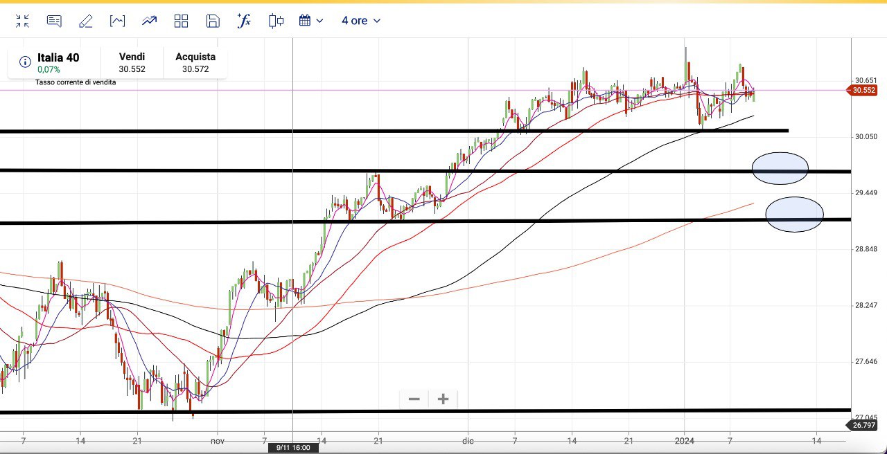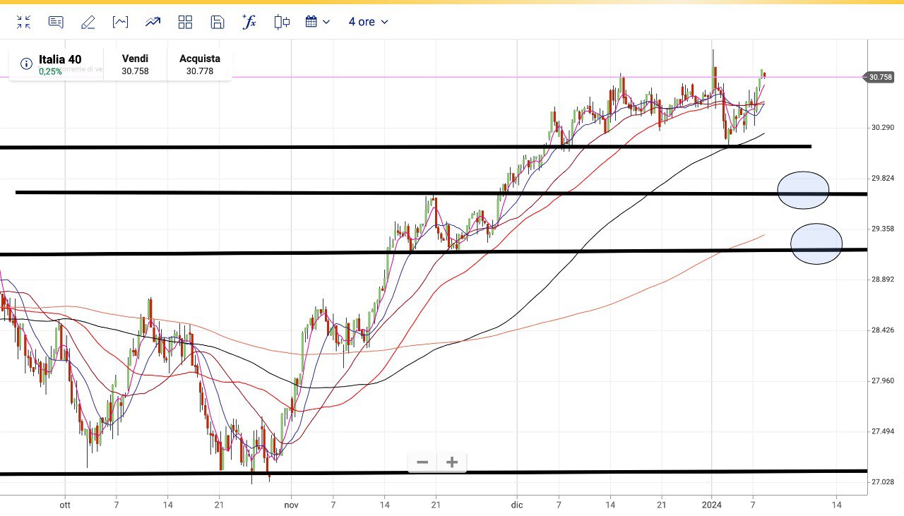 Con la tenuta del SUPPORTO attorno ai 30300 punti, il MIB è risalito dunque verso i 30800 punti, come avevamo ipotizzato ieri.