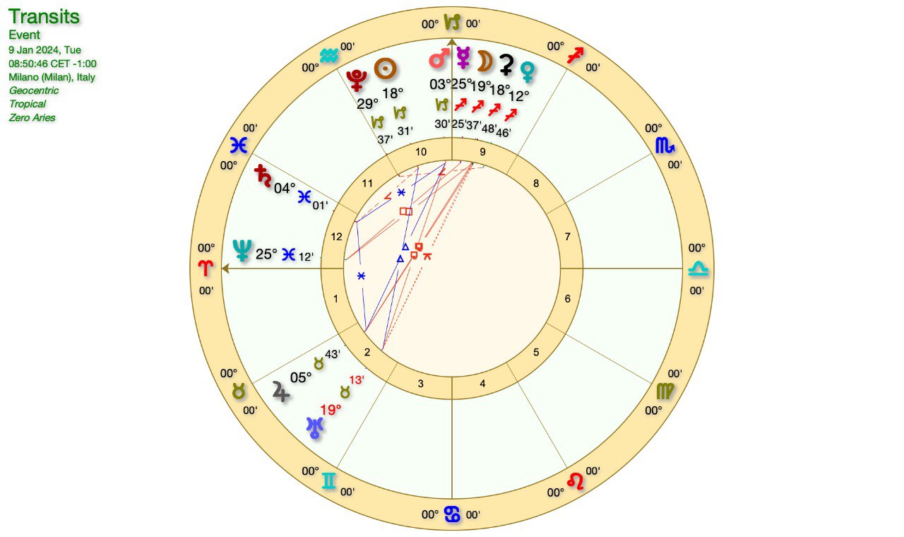 Oggi abbiamo dunque la CONGIUNZIONE LUNA-MARTE in CAPRICORNO, mentre domani avremo già la LUNA NUOVA (LUNA in CONGIUNZIONE al SOLE).