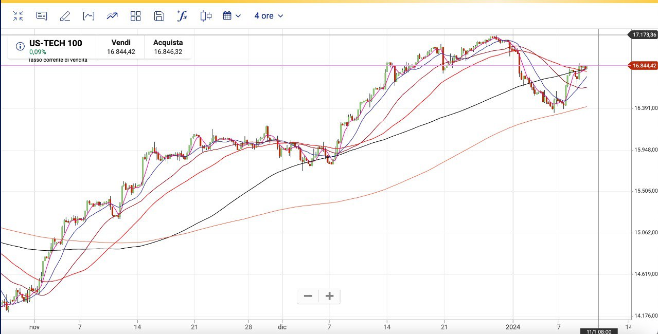 Come ipotizzato ieri, il NASDAQ 100 è salito sopra i 17000 punti e si trova quindi nella fascia dei massimi fatti in Dicembre.