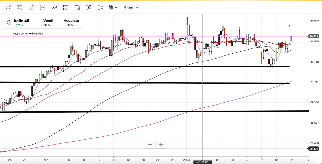 Ieri si è verificato un affondo in mattinata, respinto ancora una volta dalla zona di supporto che si trova attorno ai 30100 punti, da cui è avvenuto un parziale rimbalzo.