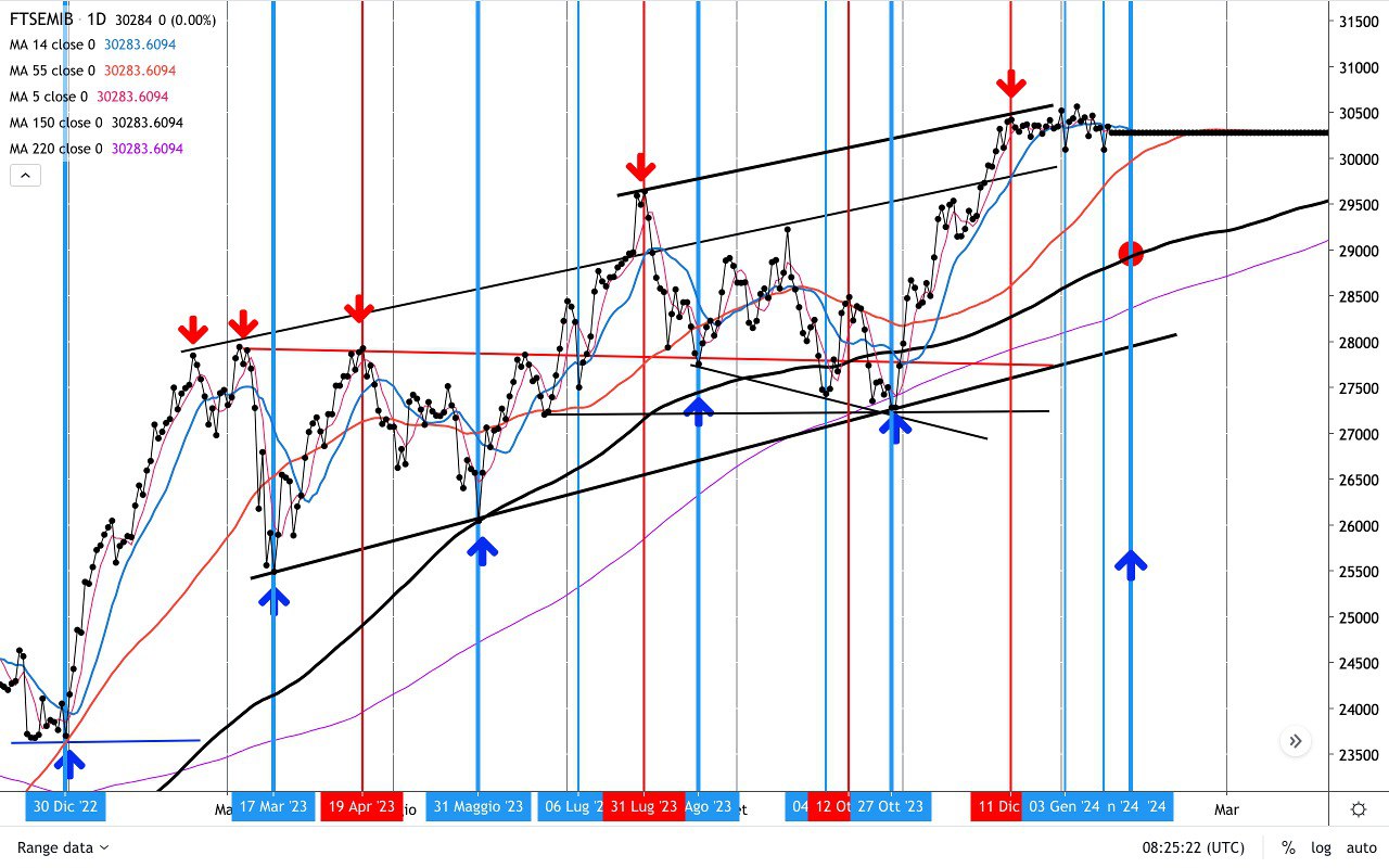 Ci saremmo aspettati un MINIMO importante a distanza di 2,5- 3 mesi dal MINIMO del 27 Ottobre 2023, da cui il FTSE MIB ha percorso quasi 4000 punti, una misura già vista da inizio 2023 al massimo di Febbraio-Marzo.