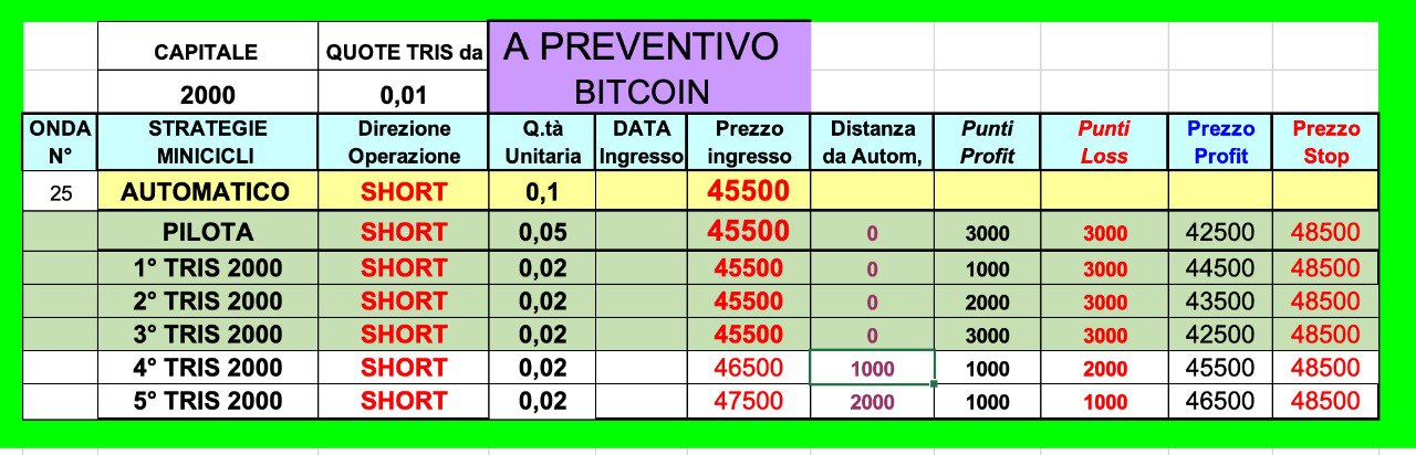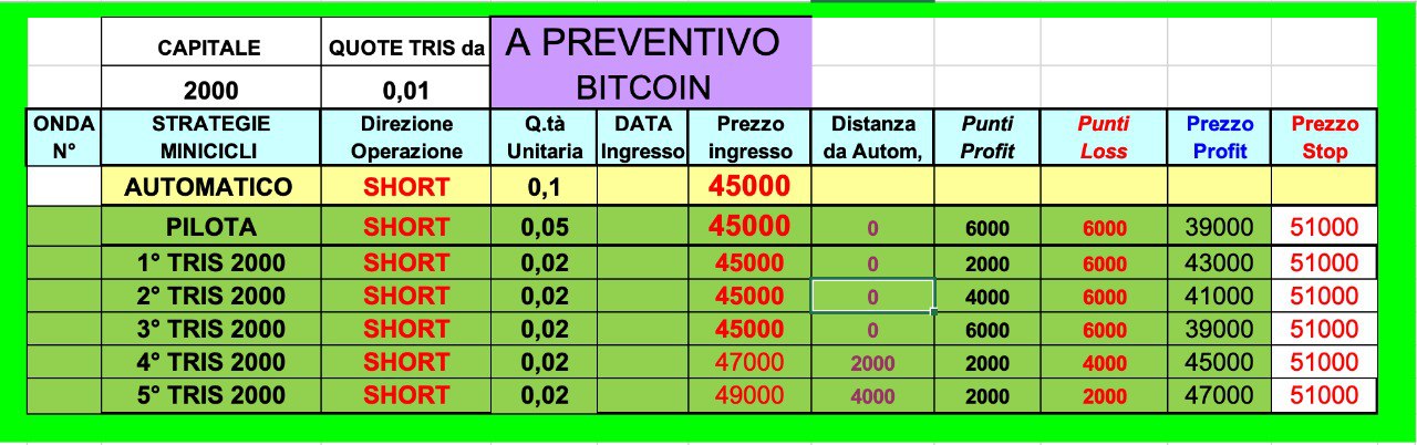 Nell’ottica delle STRATEGIE quindi, ipotizzando un ingresso short attorno ai 45500 dollari, si sarebbe già completato tutto il quadro dei take profit, dal PILOTA alle quote di TRIS.
