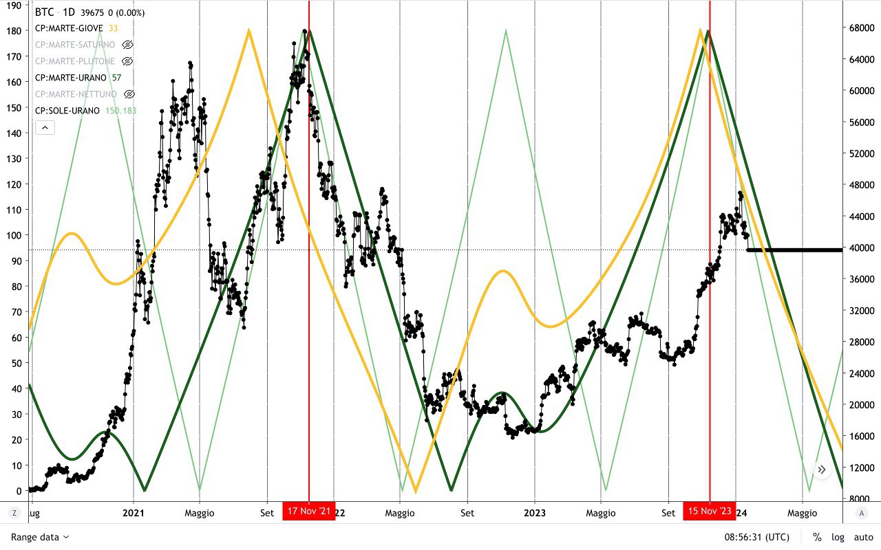 Incredibile intanto questo grafico del GIAN TRADER su BITCOIN, nella correlazione con i CICLI di MARTE.