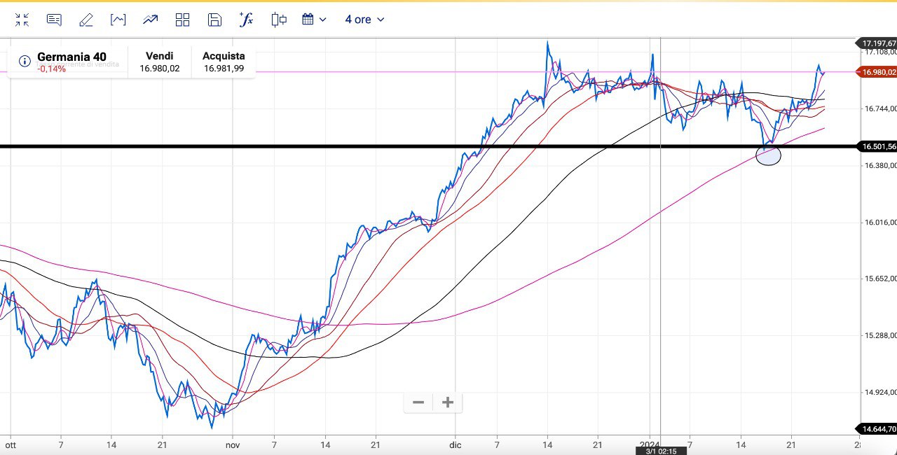 Il DAX future ha seguito parzialmente, riuscendo comunque ad andare sopra i 17000 punti, senza però toccare nuovi massimi (che erano stati fatti attorno ai 17200 punti a metà Dicembre 2023.