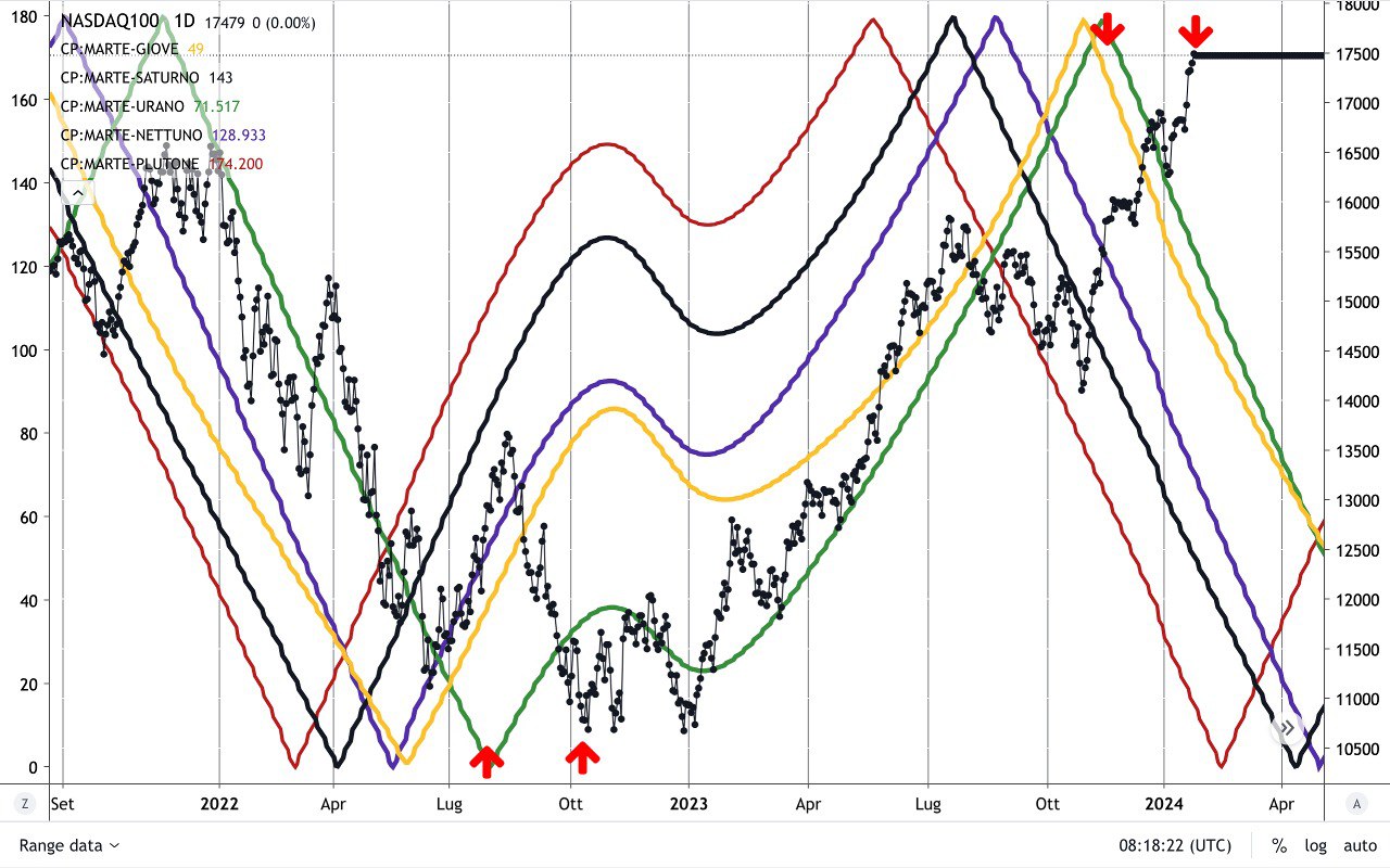 Notate che il NASDAQ 100 ha rotto la linea verde discendente del CICLO MARTE-URANO, ci è rimbalzato sopra e ha ripreso slancio verso l’alto.
