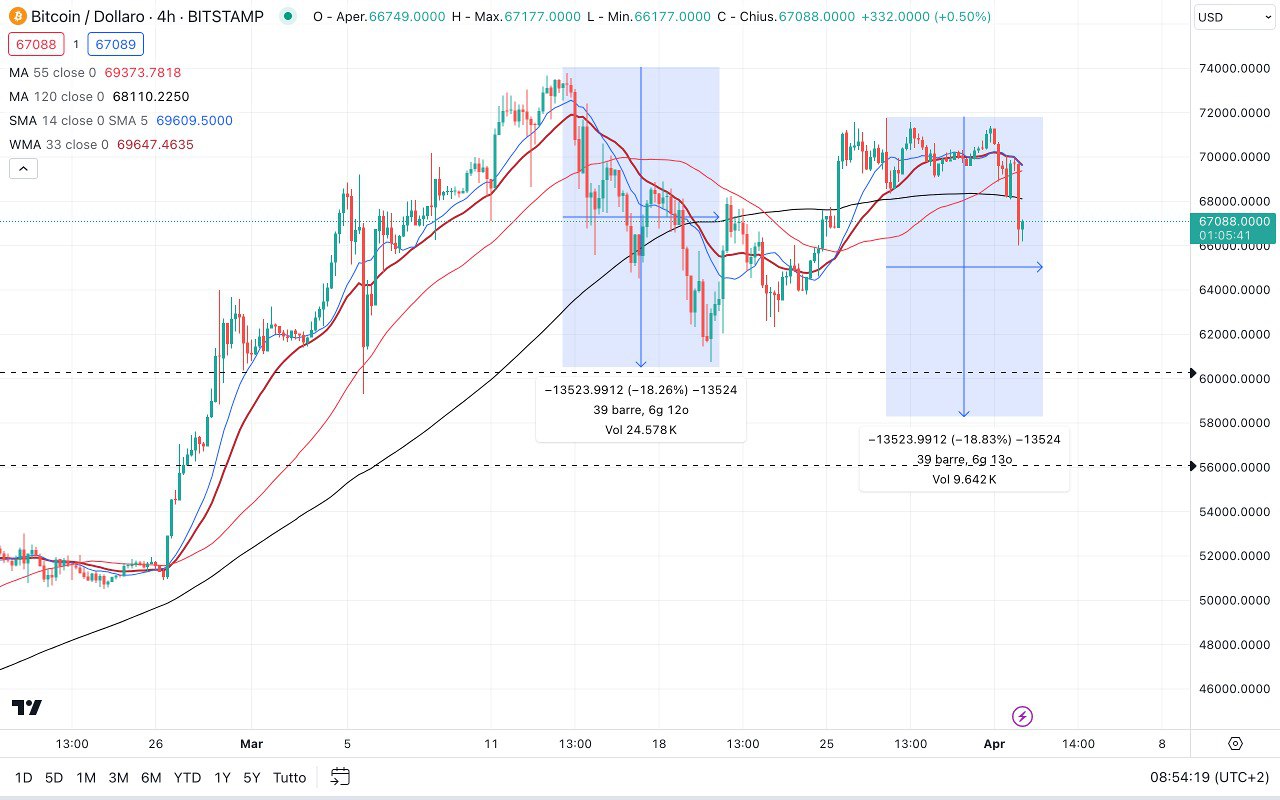 In chiave ribassista è possibile che in prospettiva si torni sotto i 60000 dollari.