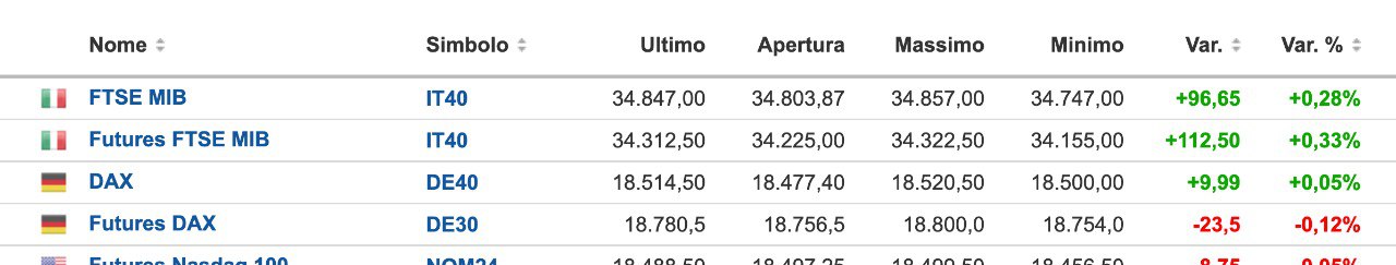 Vediamo intanto l’apertura delle ORE 9,00, con il MIB future tornato sopra i 34300 punti e il DAX future poco sotto i 18800 punti.