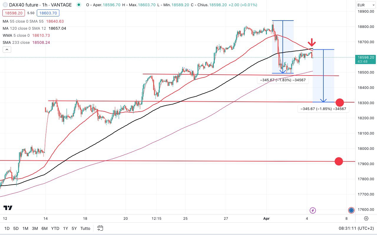 Sul DAX è stato bucato il supporto a 18500 punti, quindi stamattina si cercherà di ritestarlo per vedere se è diventato una RESISTENZA da cui riprendere slancio verso il basso.