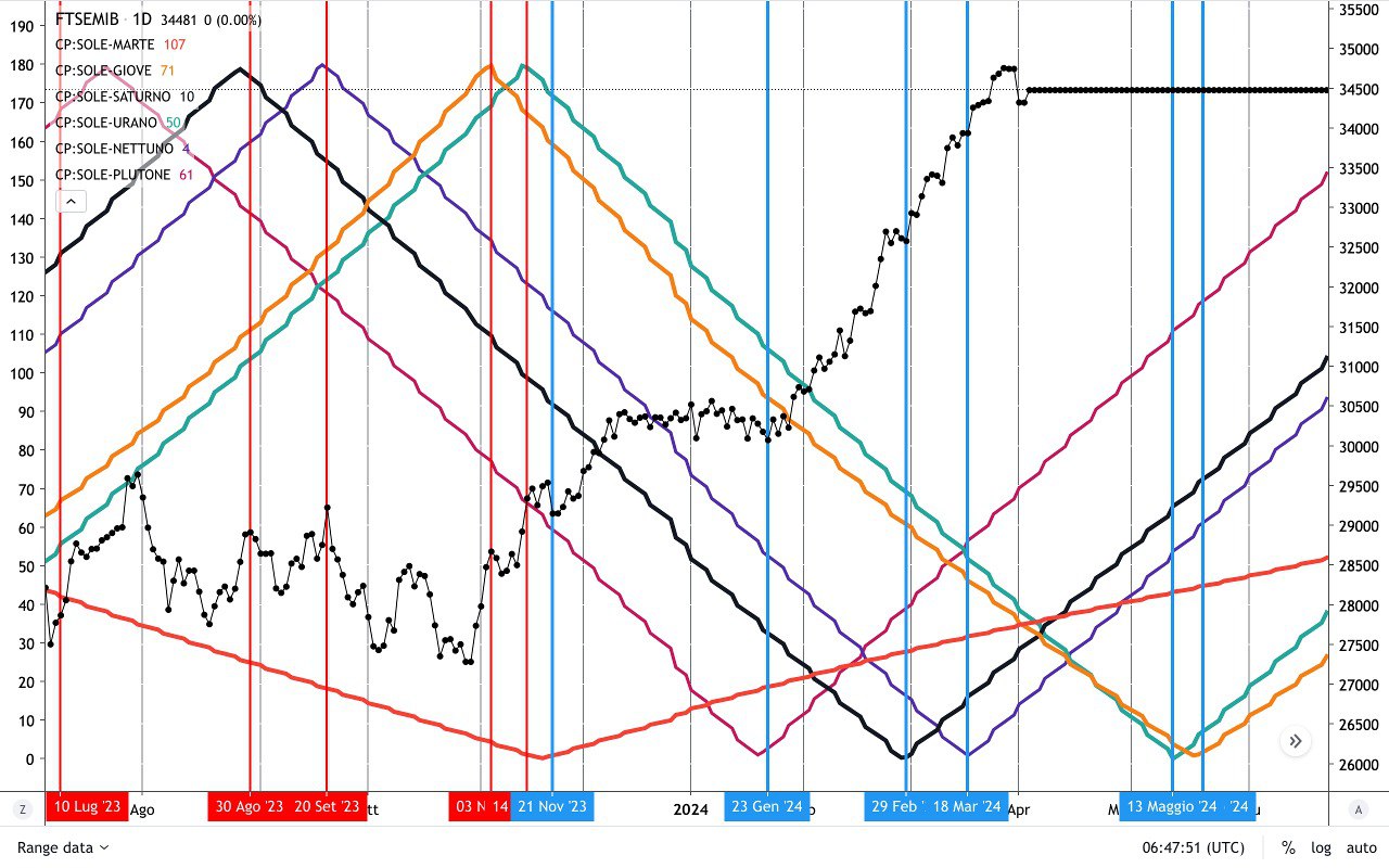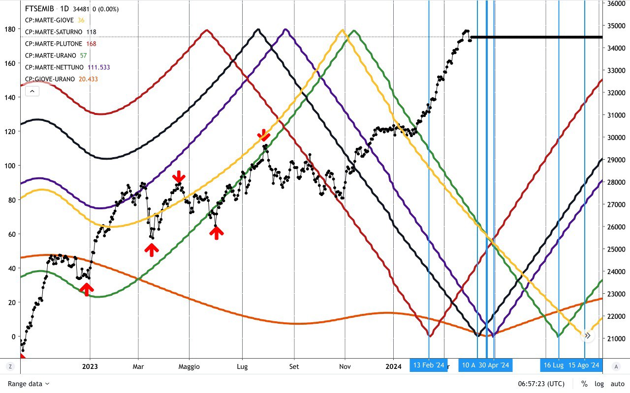 Molto interessanti anche i CICLI di MARTE, con il mercato che è uscito in modo prepotente dalle LINEE DISCENDENTI dei CICLI MARTE-URANO e MARTE-GIOVE di Novembre 2023.