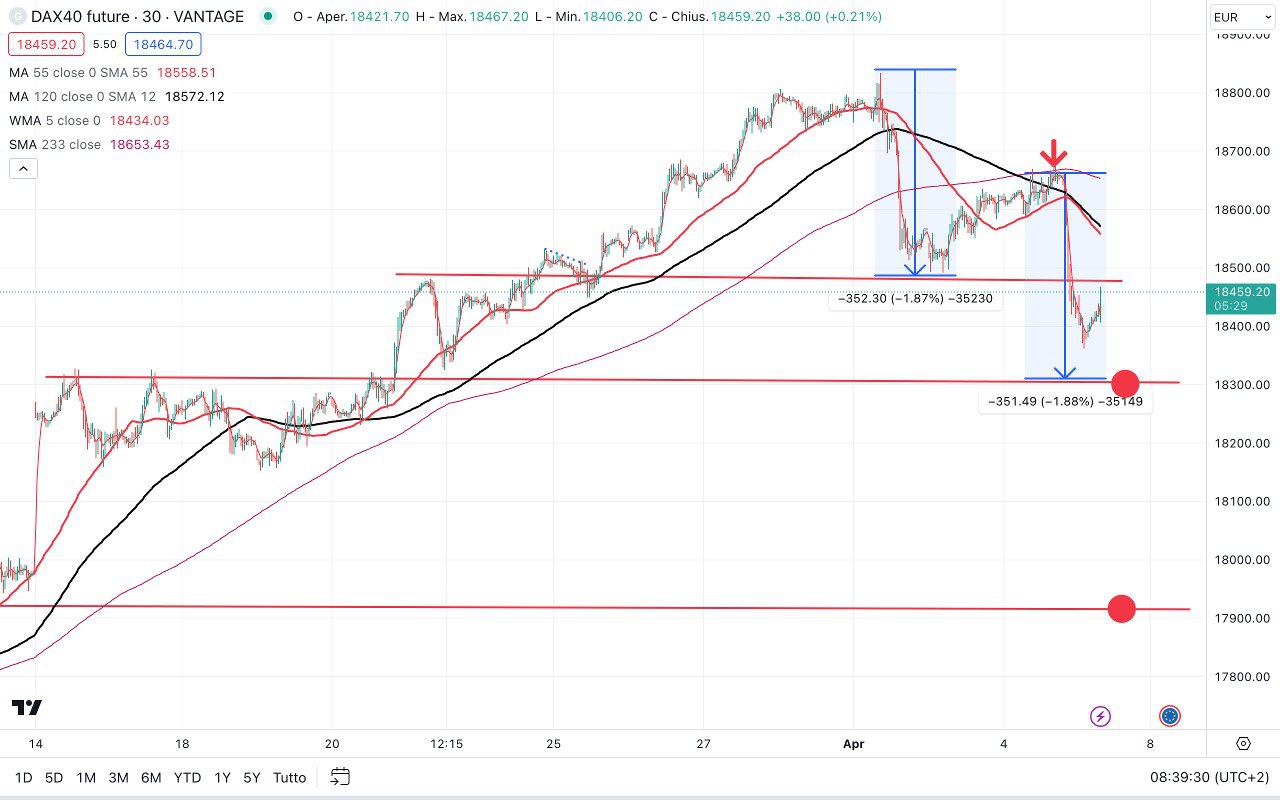Lo stesso tipo di movimento è stato fatto sul DAX, sceso dai quasi 18700 fino ai 18350 di ieri sera (circa 350 punti).
