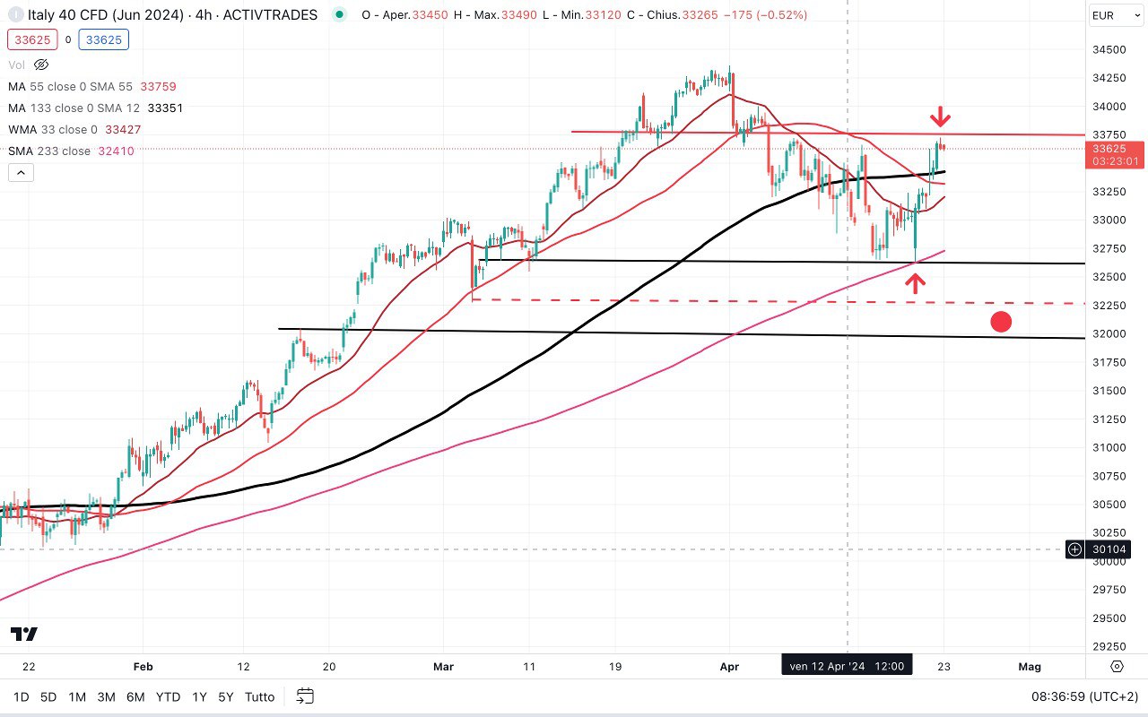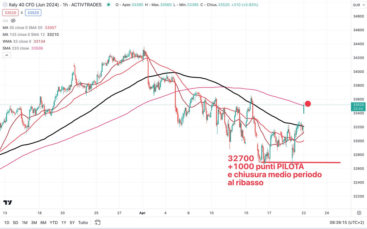 In questi casi, per orientarci in termini di PREZZO dobbiamo sempre considerare il valore dell’AUTOMATICO, che il giorno 22 Aprile era a circa 33500 punti di MIB future (dato di fine giornata).