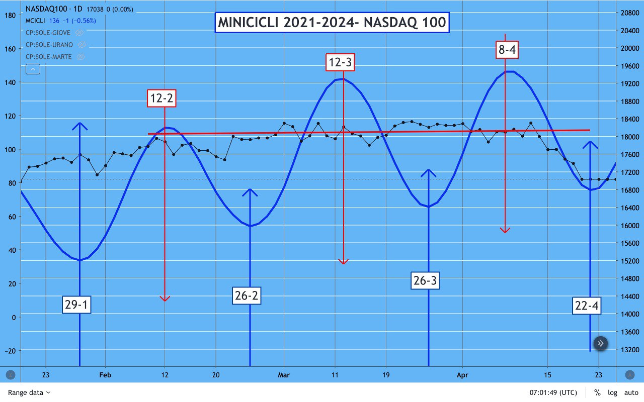 Torniamo all’attualità con il grafico dei MINICICLI sul NASDAQ 100, perchè la situazione del MIB si presta invece a più interpretazioni e a conseguenti possibili opzioni.