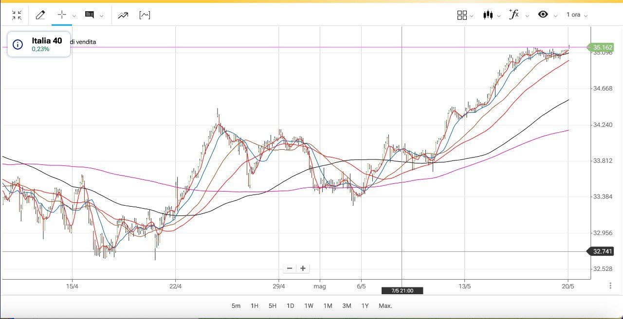 Tenendo come riferimento il FTSE MIB italiano, l’ANALISI ha già mostrato l’importanza dei MINIMI di Aprile fatti a 32700 punti, con una ripartenza che ha già percorso circa 2500 punti al RIALZO.
