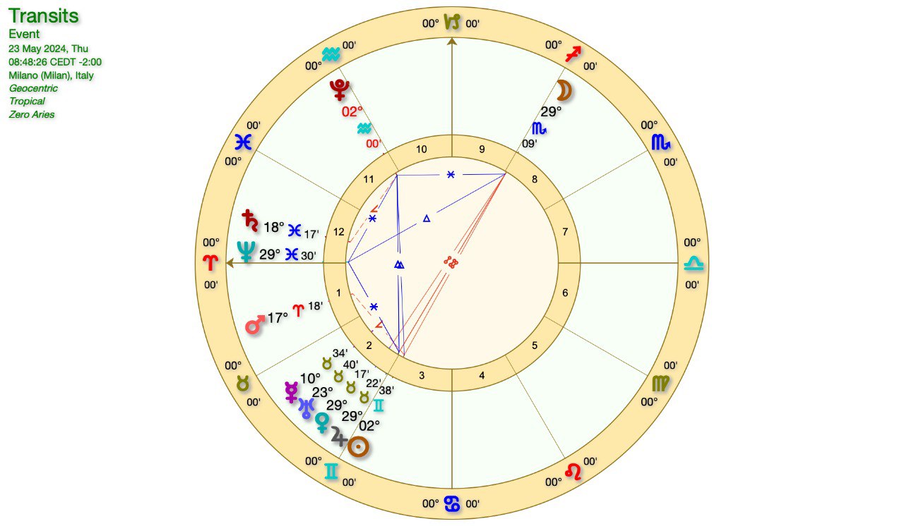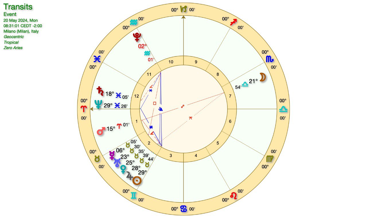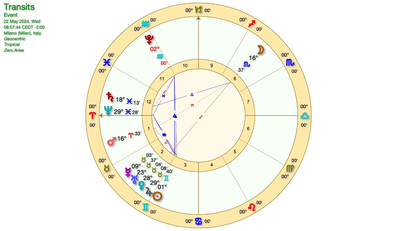 La LUNA è in SCORPIONE, in OPPOSIZIONE a URANO-VENERE-GIOVE in TORO e poi al SOLE in GEMELLI (domani).