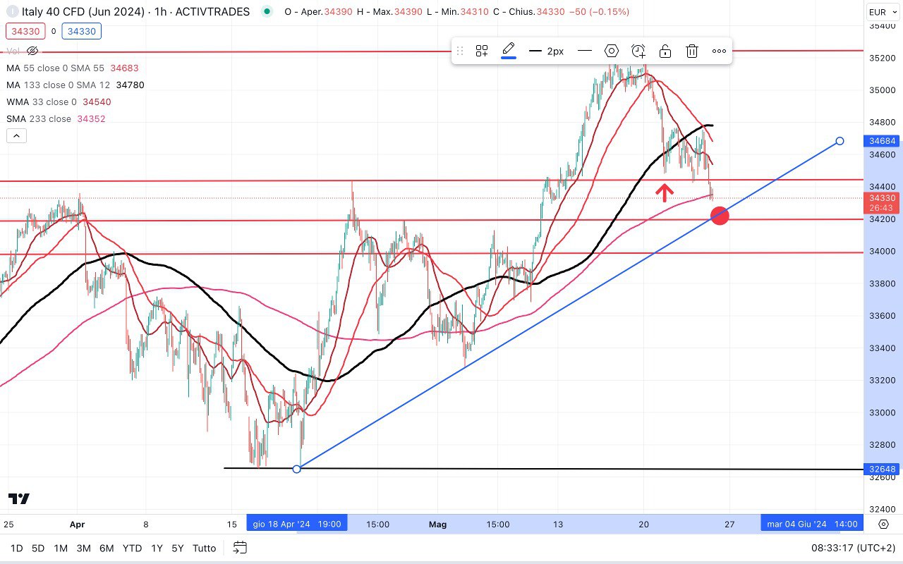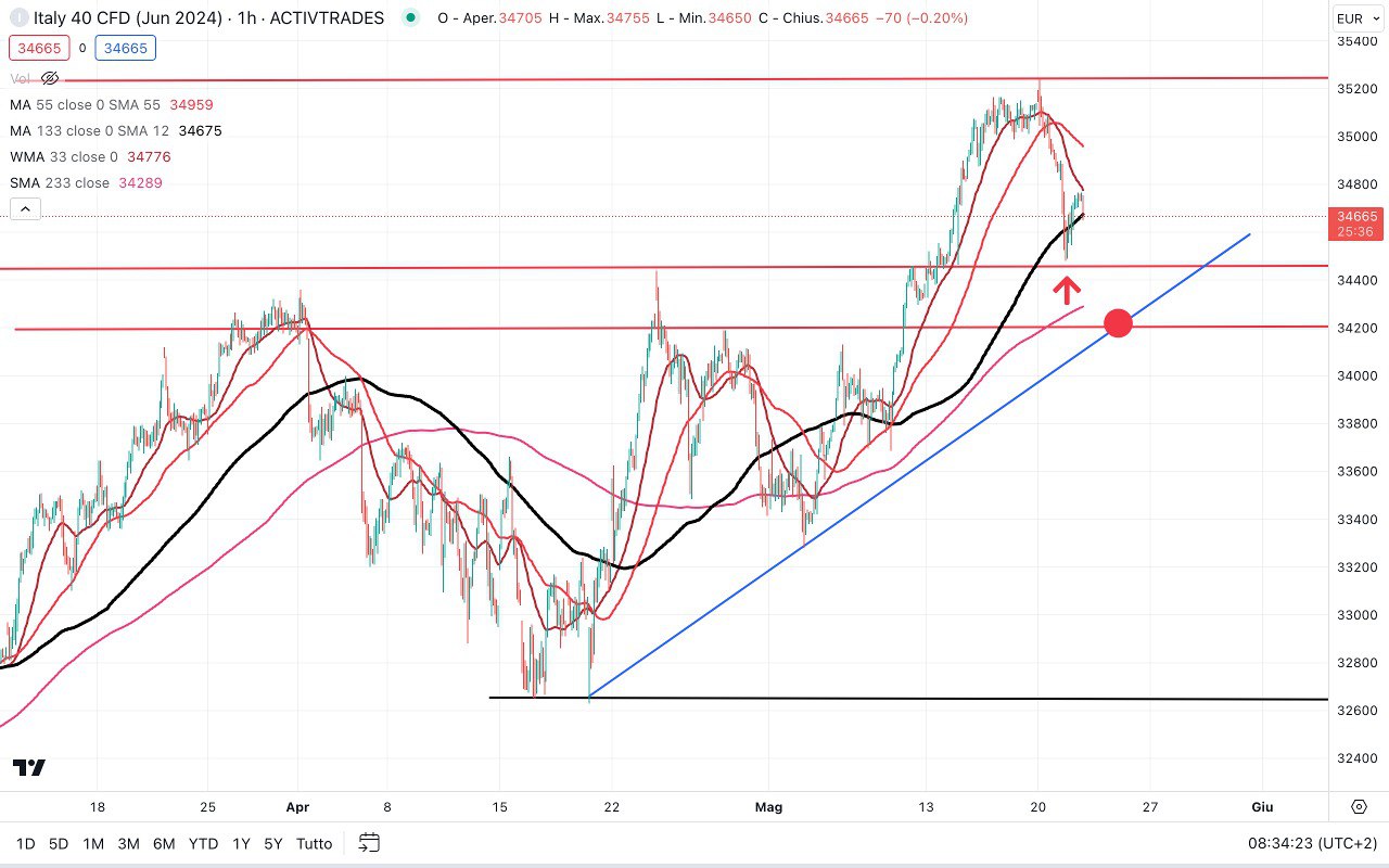 Se tale rimbalzo dovesse rivelarsi provvisorio, il prezzo potrebbe scendere verso i 34200-34300 punti, dove passa la TRENDLINE rialzista partita dai MINIMI di Aprile.