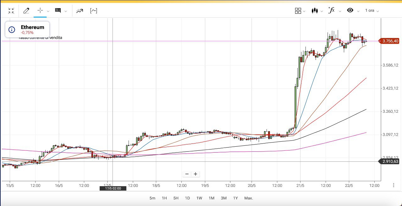 Grazie al ragionamento fatto qui sul CANALE la settimana scorsa, che ALESSANDRO ha recepito in pieno, già nella giornata di Venerdì 17 Maggio ha chiuso le POSIZIONE SHORT legate all’ONDA precedente dei MINICICLI ed ha INVERTITO al RIALZO su BITCOIN ed ETHEREUM, beneficiando così del forte impulso rialzista.