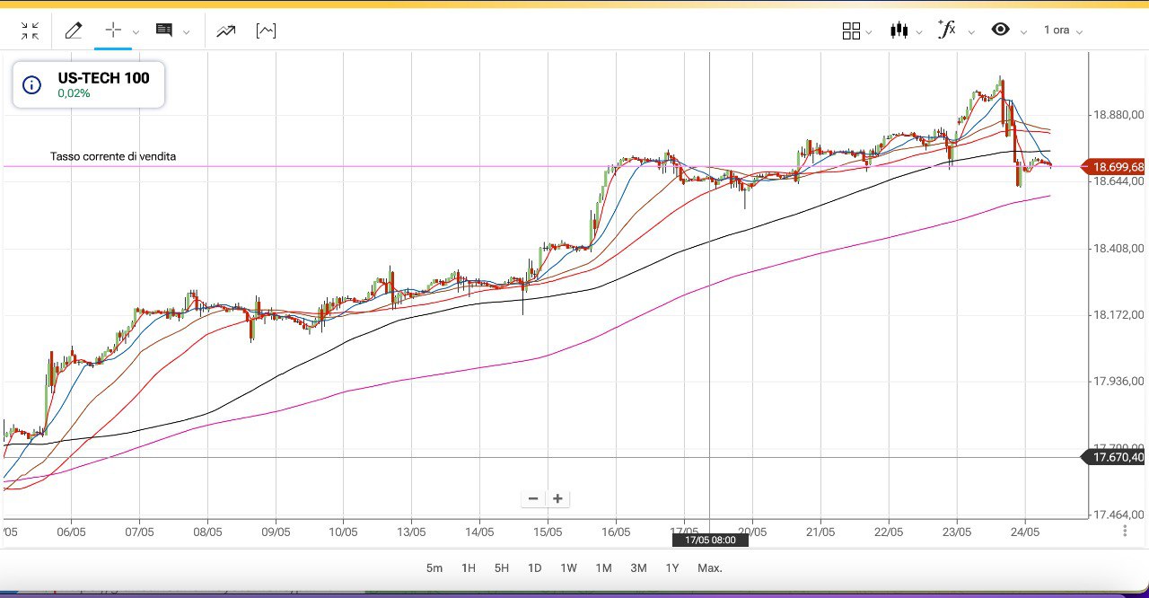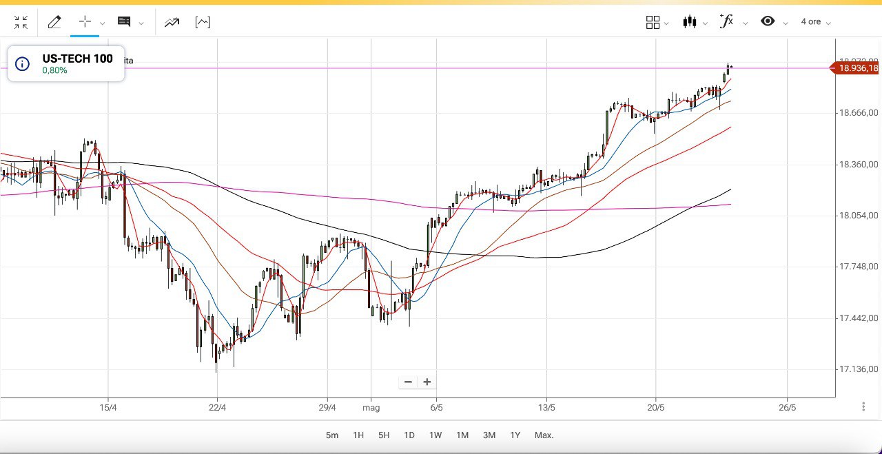 Proprio il 22 Aprile, che era il MINIMO teorico dell’ONDA dei MINICICLI, il NASDAQ 100 arrivò fino alla soglia dei 17000 punti, per poi ripartire con forza fino ai quasi 19000 punti attuali.