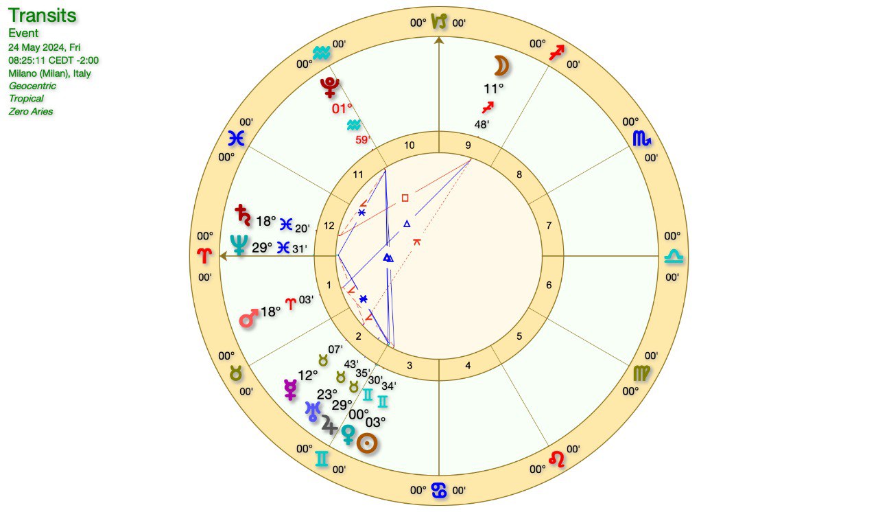 Passiamo ora al grafico astrologico, con la LUNA che sta lasciando lo SCORPIONE per entrare in SAGITTARIO.