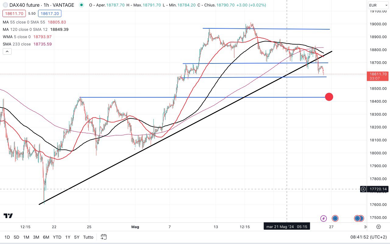 Sul DAX future il “test” sulla TRENDLINE rialzista potrebbe già essere avvenuto ieri attorno ai 18700 punti ma abbiamo già analizzato quale potrebbe essere lo scenario in caso di rottura (che non è detto però avvenga nell’immediato).