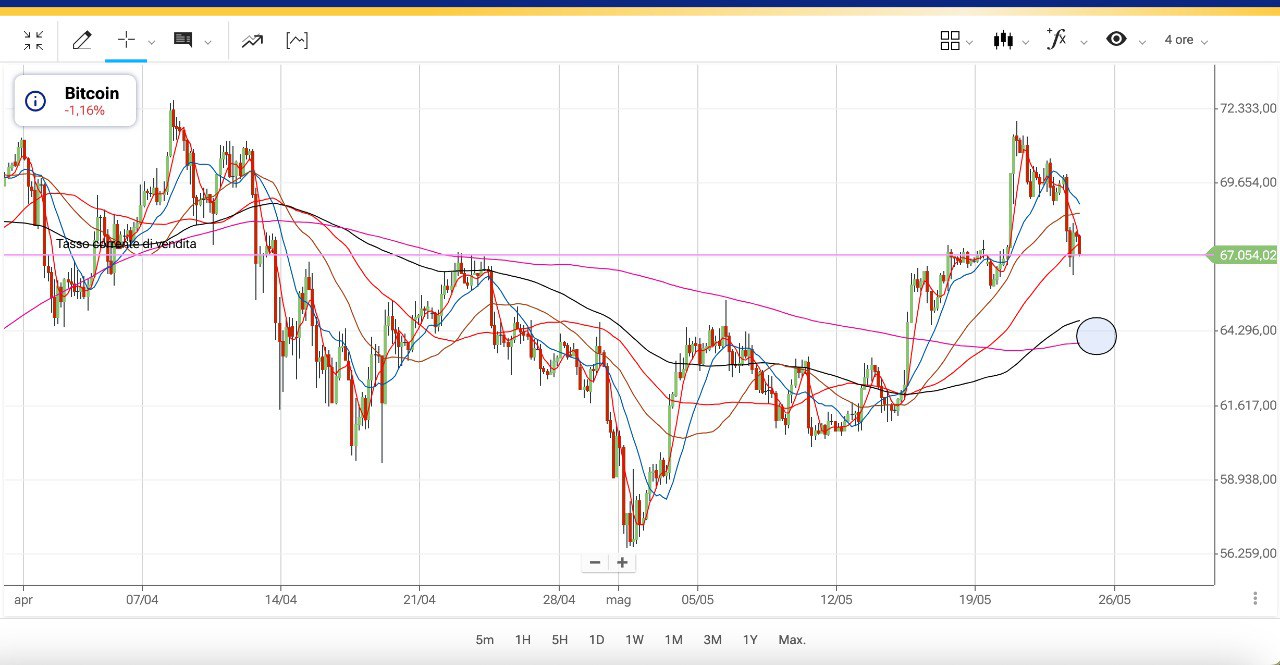 Un discreto ritracciamento si è avuto sul BITCOIN, che dai 72000 dollari del 21 Maggio è sceso fino ai 67000 dollari attuali.