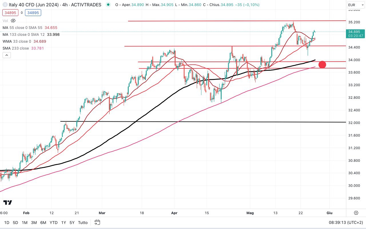 Il MIB ieri è salito fino ai 34950 punti circa mentre ora siamo attorno ai 34900 punti.