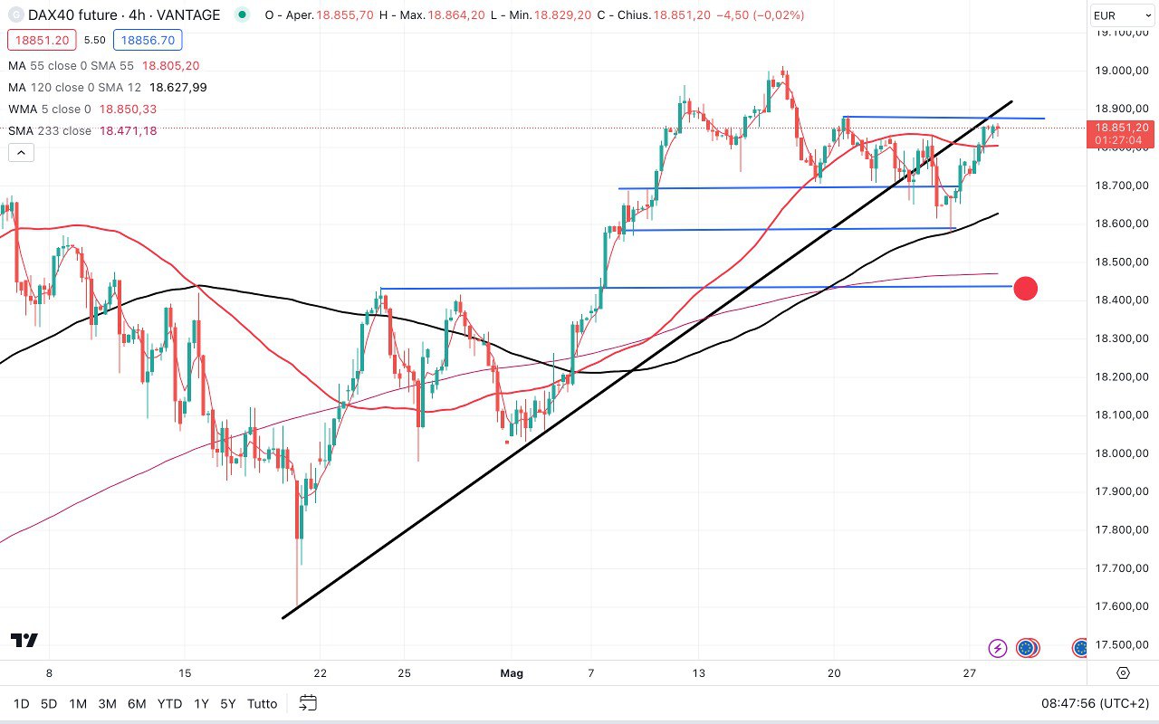 Il DAX si sta muovendo intanto attorno al punto di pareggio di inizio ONDA attorno o poco sopra i 18750 punti.